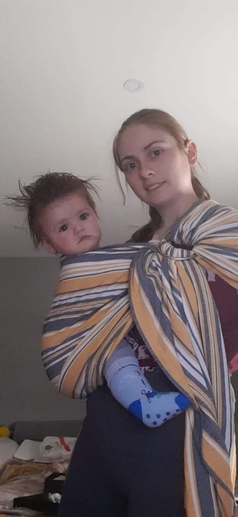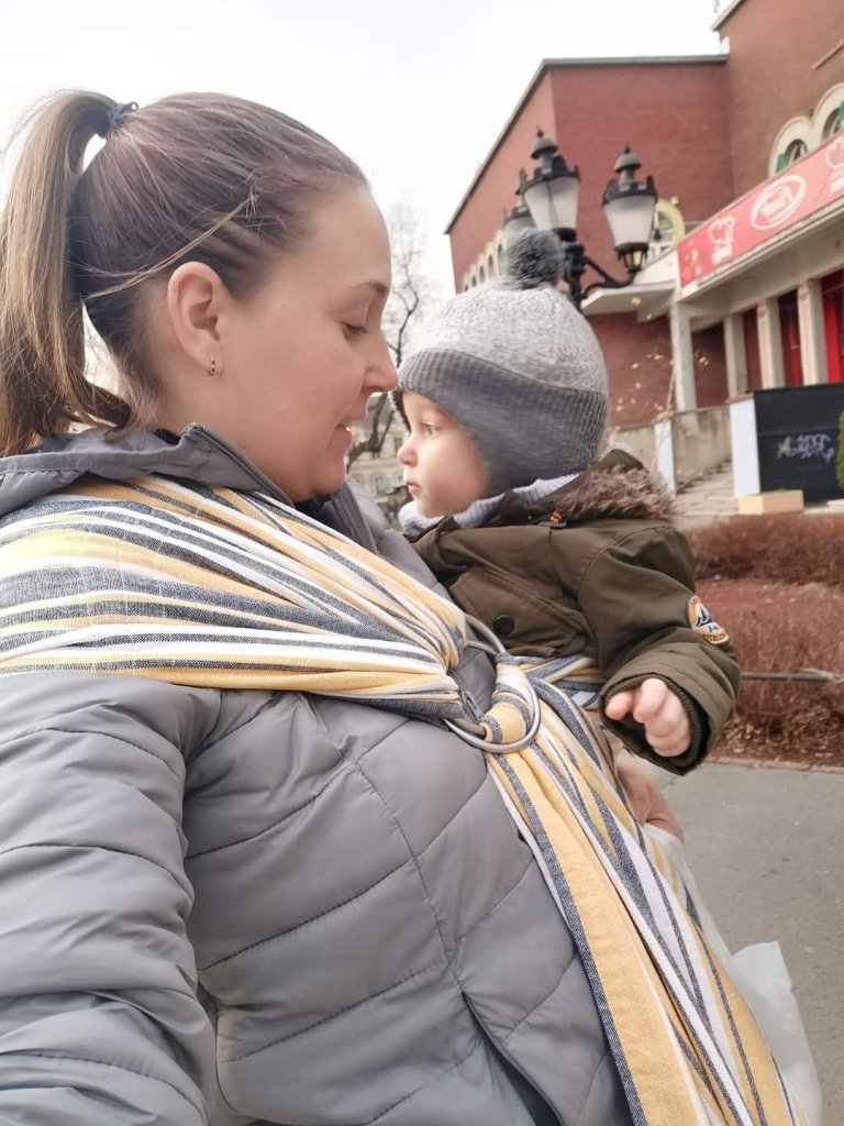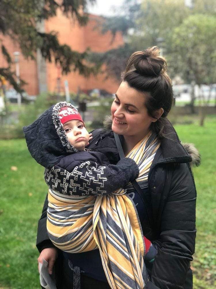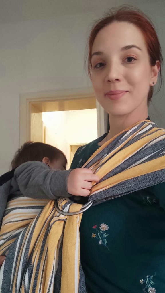 Thanks to Lenine putujuce nosiljke (Lena’s traveling carriers) I had the opportunityto test this beautiful ring sling. It came to me brand new but it was not hard to use at all. It is actually very soft and easily glides through rings. Baby testee is 18 months old and around 11 kg weigh and sling held him very good. Thanks again for this lovely opportunity💛🖤💛