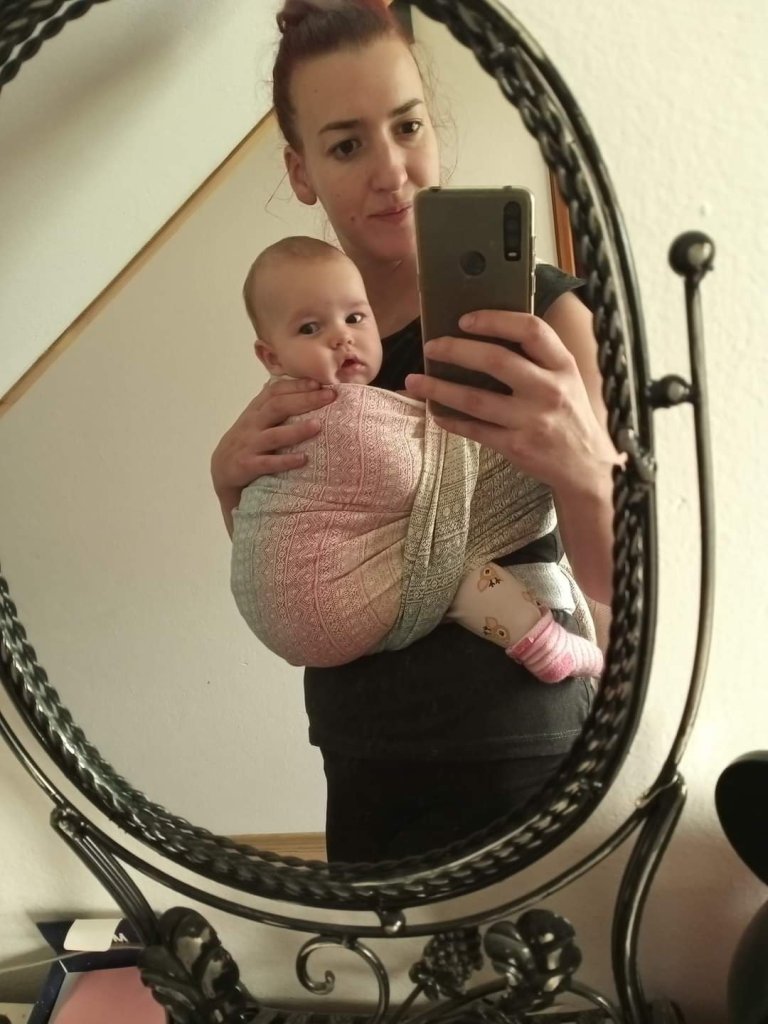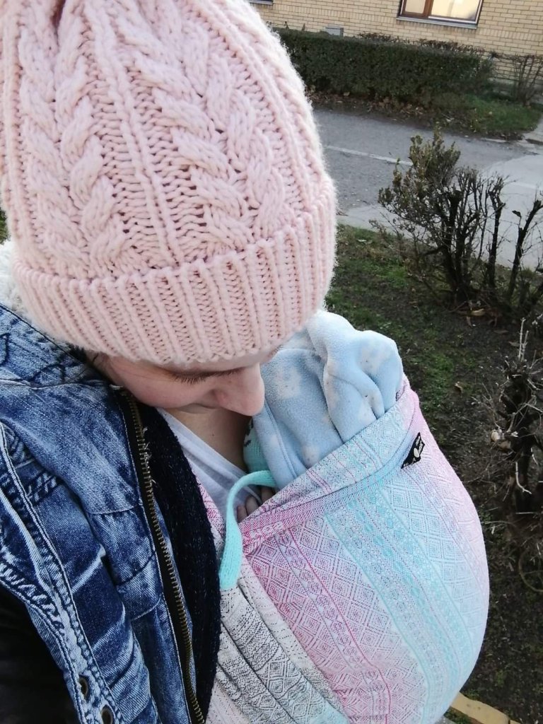 My baby and I had the honor of borrowing this wrap for one wedding. The wrap is beautiful, beautifully woven and beautiful colors, which is why they go well with a lot of clothing combinations, both elegant and casual. I completely fell in love with it. Despite the small gsm it holds my 8kg baby quite nicely. Thank you very much Lena’s traveling carriers for the opportunity to try this wrap, and now I would like to have at least one of my own from this collection, because I like it in all colors.