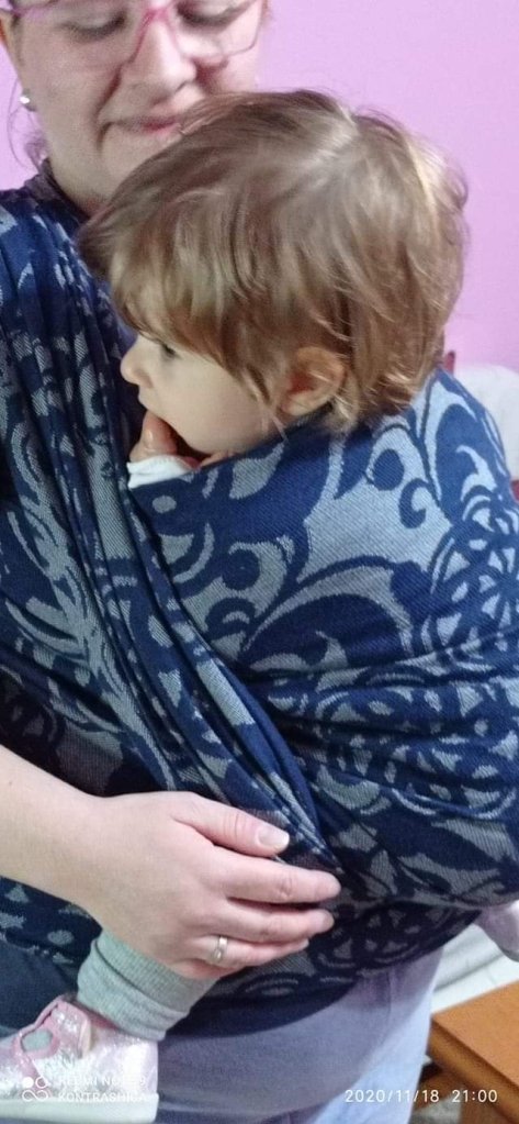 O my God, this wrap! I was blown away, it’s is just amazing! The design, the color is so pretty, one of my favorites. It is so soft, it wraps by itself, I can’t even explain how easy it is to work with it. It’s like a cloud on shoulders, but it doesn’t move at all once tied. It can even handle a sloppy wrap job, I’m sure. I really can’t find enough words to tell how much it surprised me when I tried it on. I liked it on a first touch, but loved it on a first wrapping. Thank you, Lenine putujuce nosiljke (Lena’s traveling carriers) and Darija Maho💗