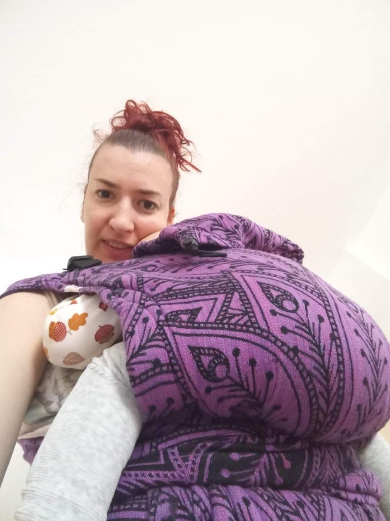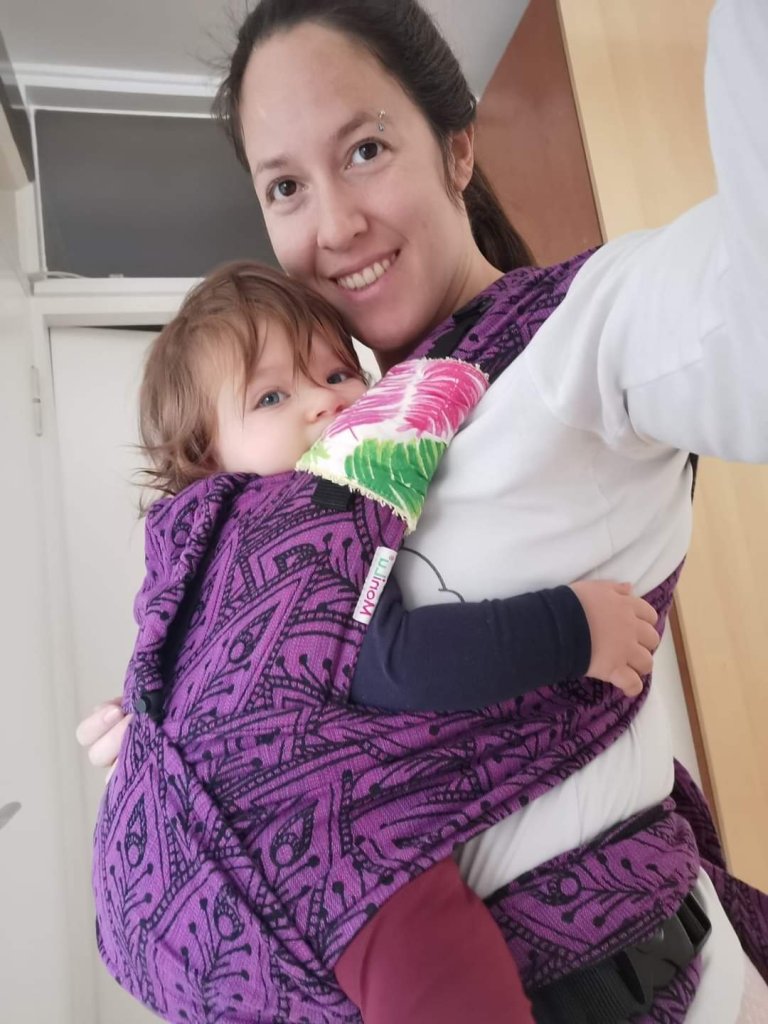 MoniLu uni tai peacock lilac is a kind of my favourite carrier – half bucke. It is easy to put on, back carry or front doesn’t matter. It comes in my favourite colour, so it was pleasure to wear it. We enjoyed. Thank you MoniLu and Lena’s traveling carriers for this joy 🥰