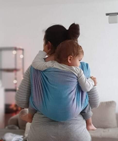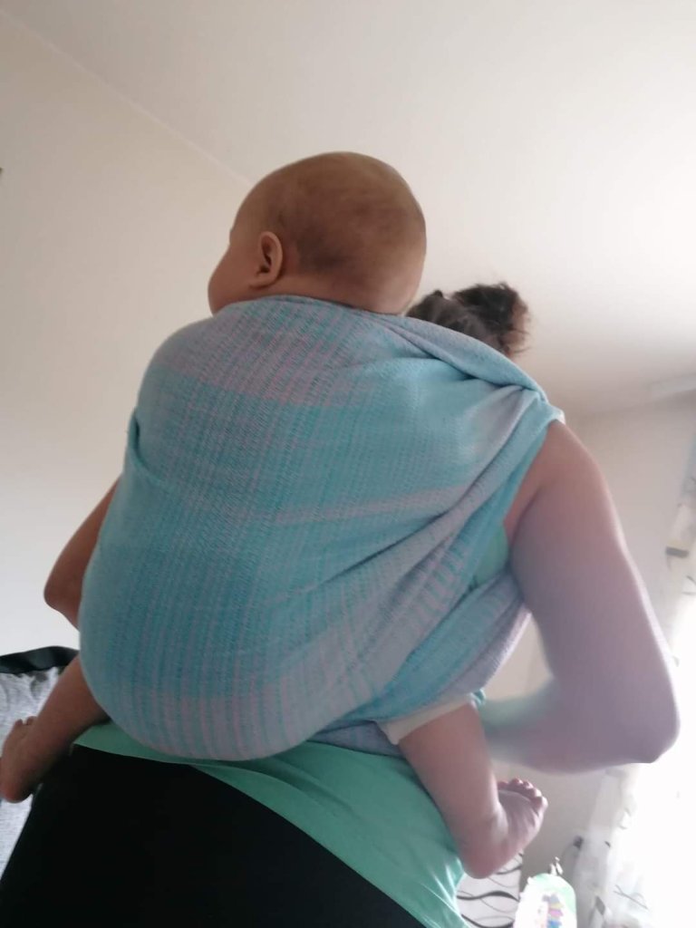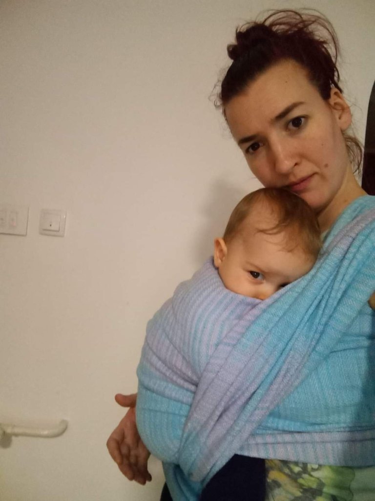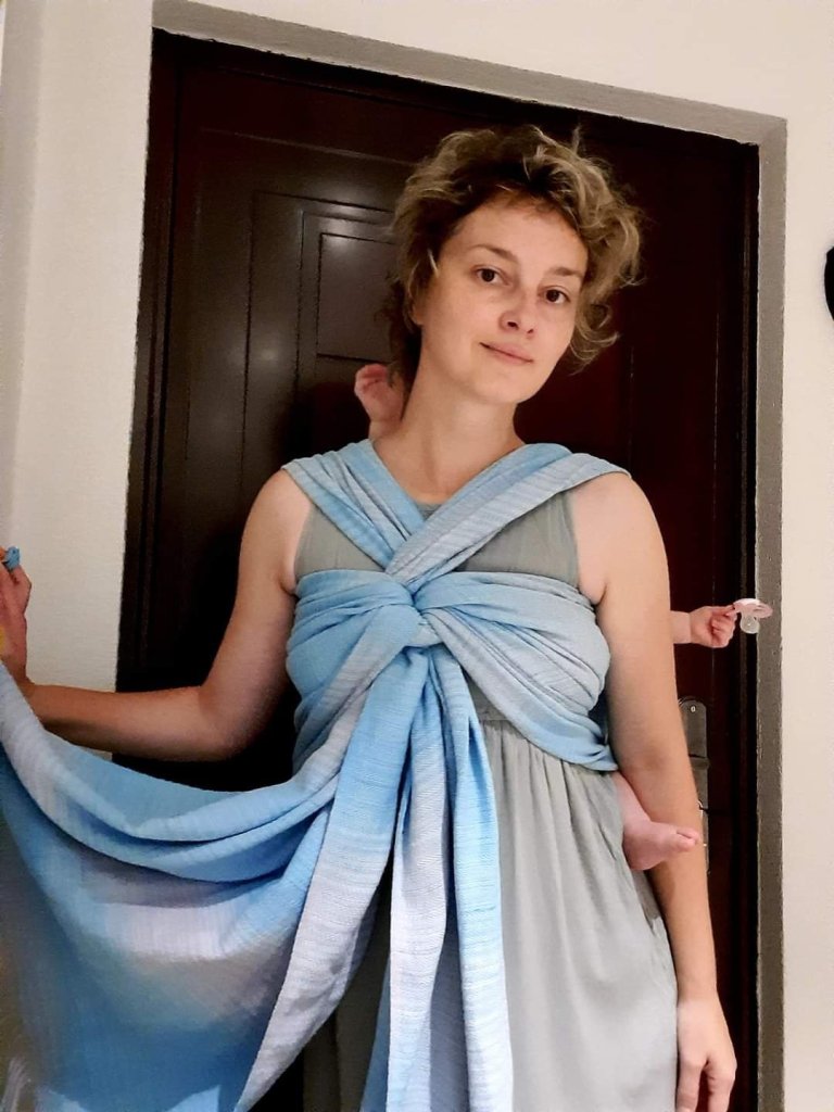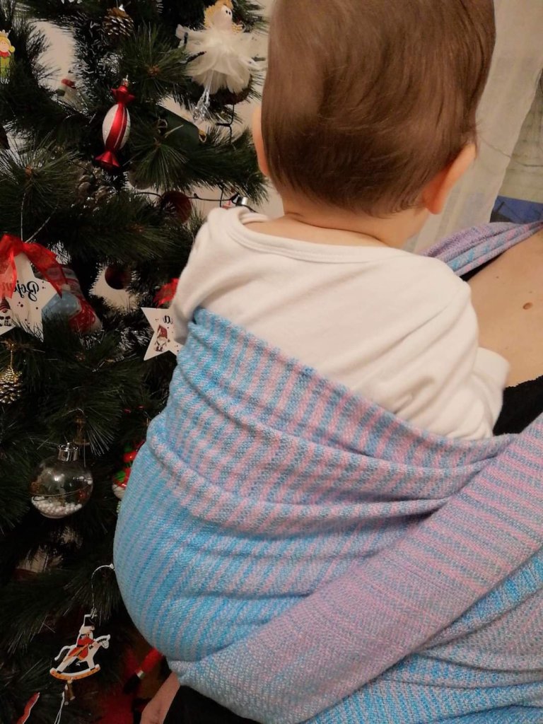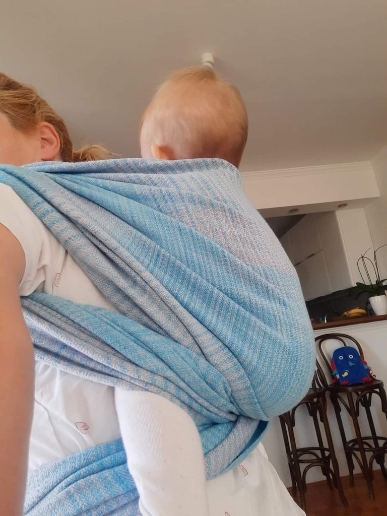 Great pink and blue gradation makes this wrap ideal for baby boys and baby girls. When I touched this wrap I understood why It was so praised. Very thin and soo soft, it carries my almost 10kgs baby perfectly. I tried several carries with it and it was like it took half of his weight. It didn’t dig anywhere and it carried beautifully. I enjoyed touching this wrap and carrying my baby in it. Thank you Vesna Djinovic and Lena’s traveling carriers on this chance to try this perfect wrap.