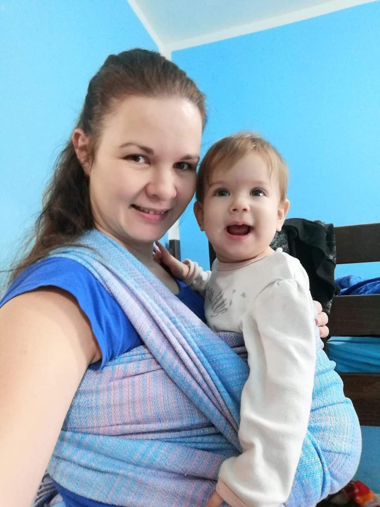 First time I didn’t feel any back pain during carrying my baby, and I carry her more then two hours, she is 6 months and 6,5 kilos. This wrap really left me out of words! Design is beautiful, sky blue with pink on ends. You can see our photos to make complete picture about this wrap, because this pure happiness I can’t explain with words 💗