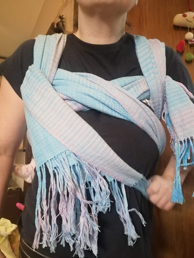 I have been at the end of bw experience and I dont bw daily anymore. I applied to try this wrap because I think I need more HW experience in my ,,wraper carrier,,. This wrap reminds me of blue jeans,summer day and candies . It is great combo for both teams-blue and pink. I like fringes on this wrap. The length is ok without cothes, while for wrapping in this winter time, I would need a longer one. It is so thin , you dont have bulky material on your shoulders.