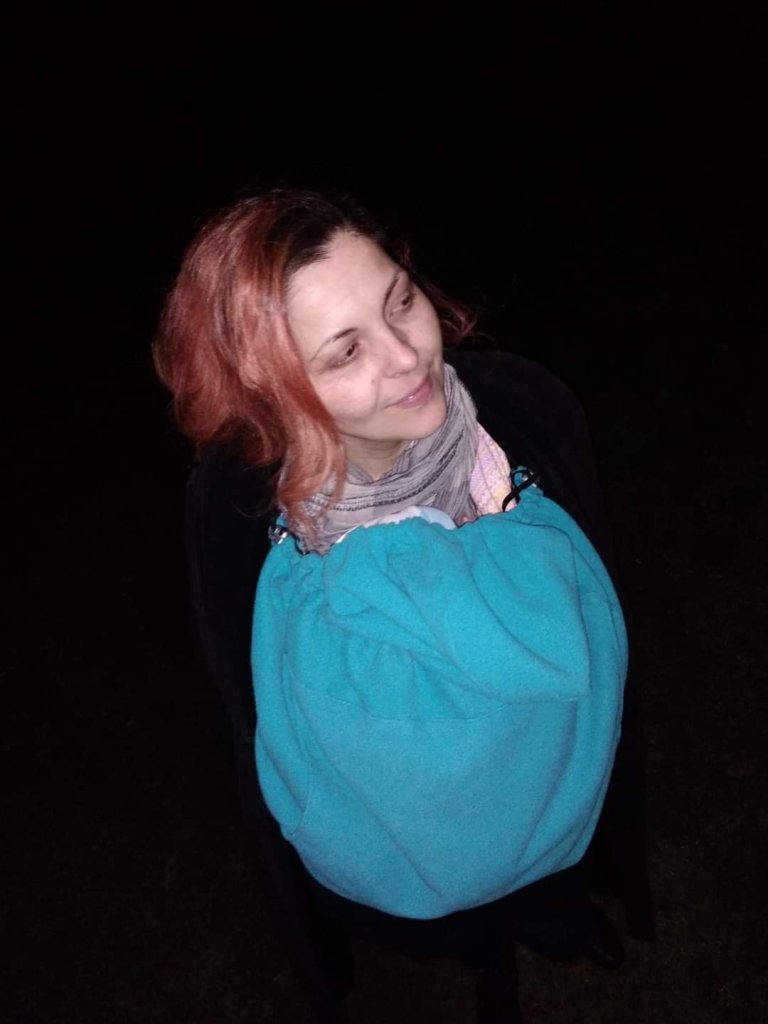 Anđelčić, this lovely turquoise colour is just so beautiful… When it arrived it was rainy and cold weather… We wore it for about a week or two and enjoyed its warmth, but then suddenly the temperature rose above 18° and it was sunny. It was quite hot but that didn’t stop us to take the cover with us for evening walks when it got chillier. Thanks Lenine putujuce nosiljke (Lena’s traveling carriers) and Anđelčić Kreativna Radionica for this wonderful opportunity to keep us warm through carrying and hugs.