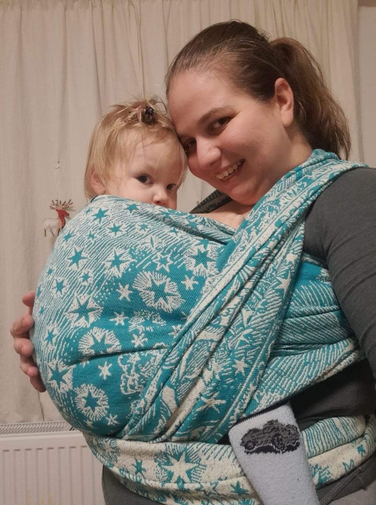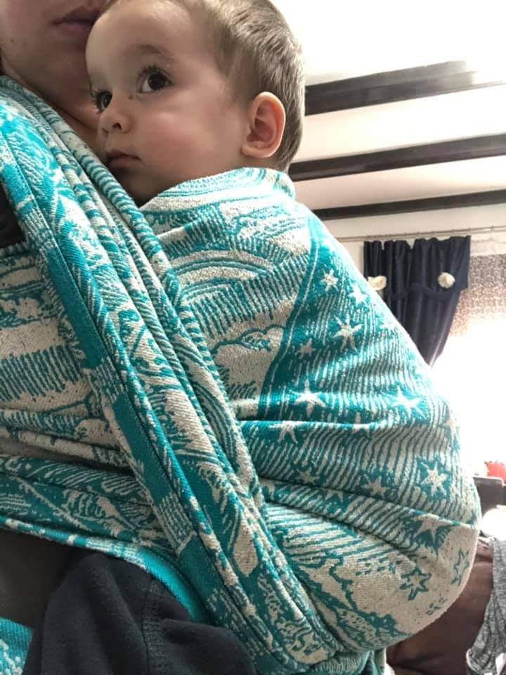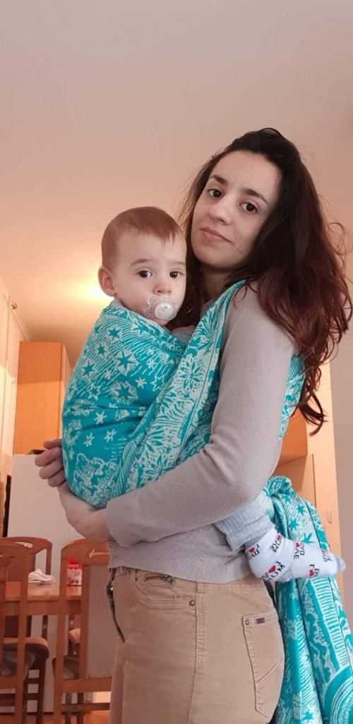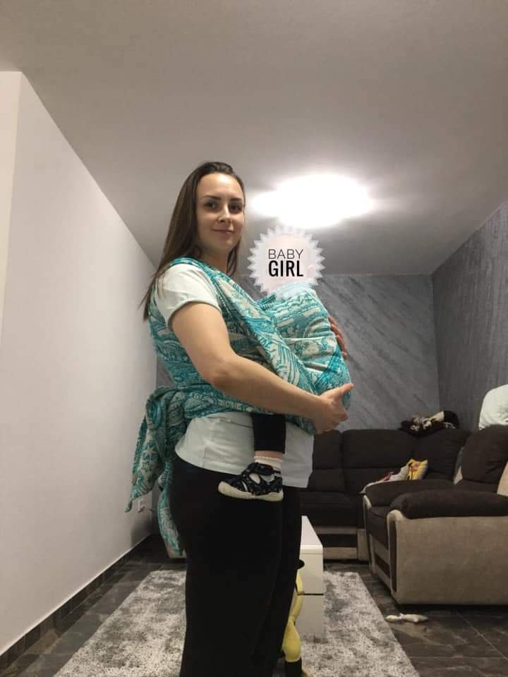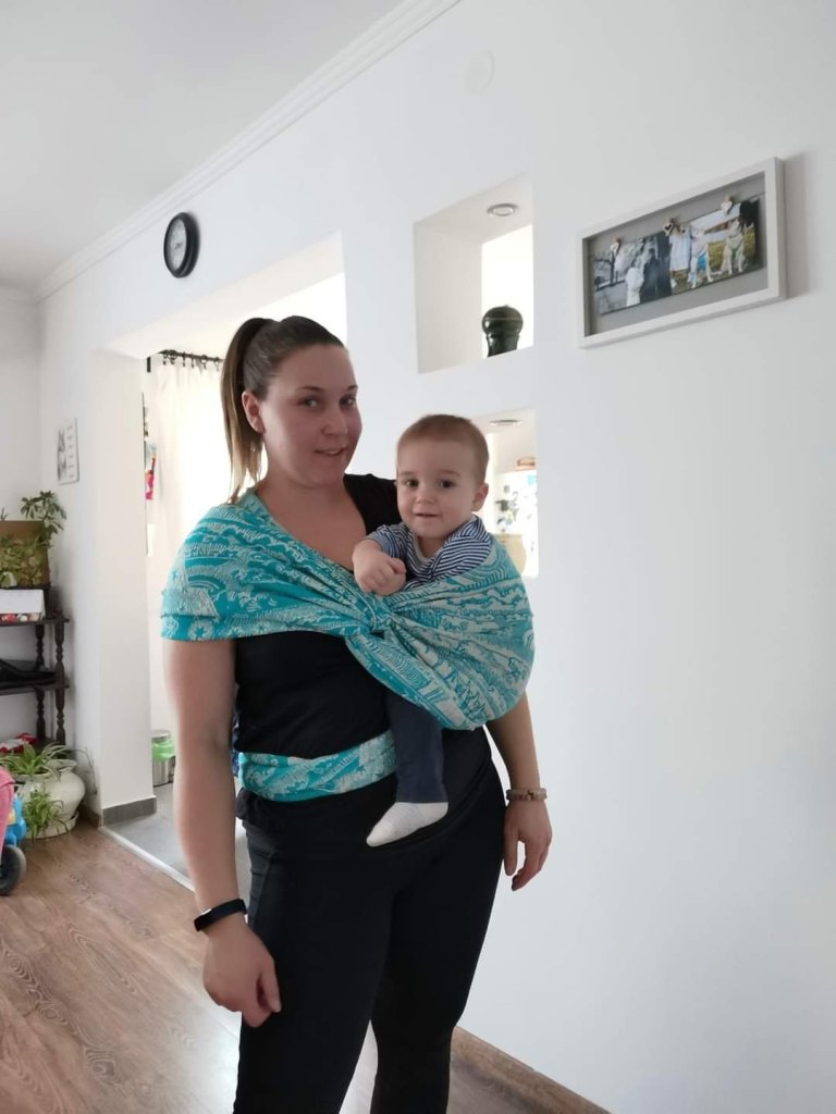 I am delighted that I had the opportunity to try out this beautiful woven wrap. Soft to touch, cozy for both mommy and baby and fits nicely. Wrapping is something that should be practiced a bit, but I can say I made the front carry very easily since I used to wear both of my children in an elastic wrap. I felt very comfortable carrying my baby around and she liked it very much. Actually, she fell asleep after 5 minutes only, during the first trial. 😊 Also, I have to say that the timing of woven wrap arrival wasn’t very suitable for me since I am working and I am pregnant for the third time, therefore I couldn’t manage trying out all types of tying that I wanted but I imagine there will be time to do so. I can just conclude that it would be great to possess a beauty like this and I can honestly recommend to all mommies and mommies to be to give these beautiful wraps a chance!
