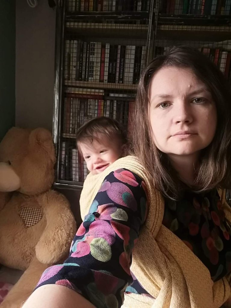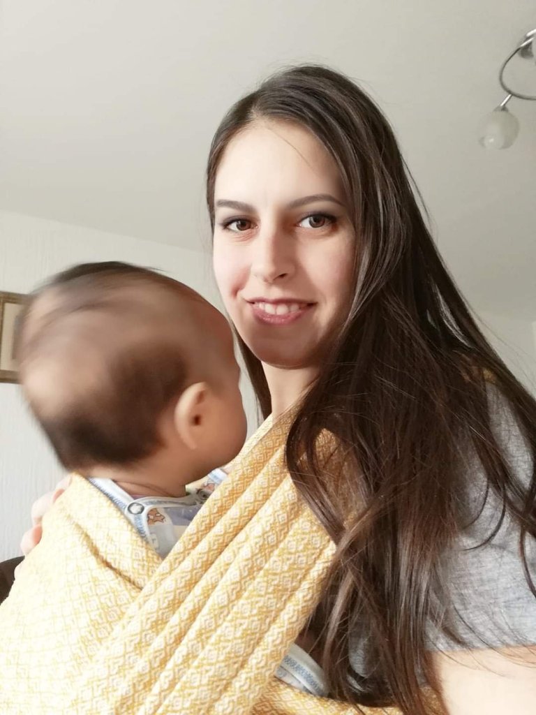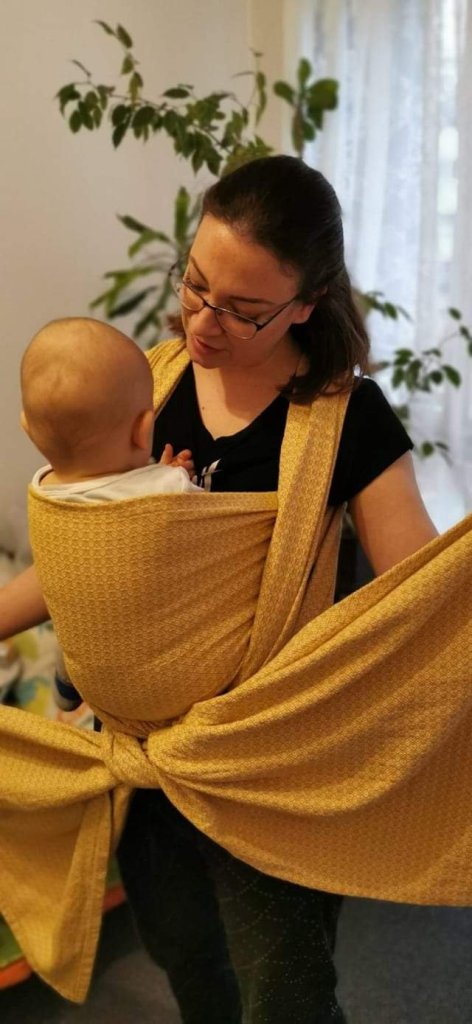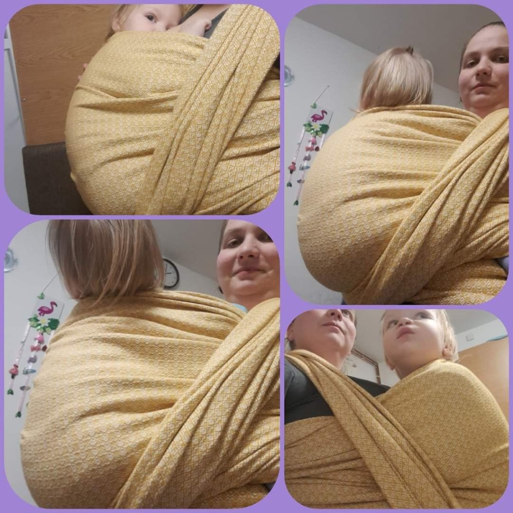 Thanks to l I had a chance to wrap my baby into this beauty. I love this pattern and the colour is beautiful golden. Diso bisous is really powerful wrap perfect for the whole babywearing period. It easily holds my baby (13m, around 10kg), yet is so soft, moldable and comfortable on my shoulders. Few minutes later after taking this picture she was in a dreamland. I carried her for an hour without the urge to get her out of it. Really nice and comfortable. I’m very happy for this chance to test it.