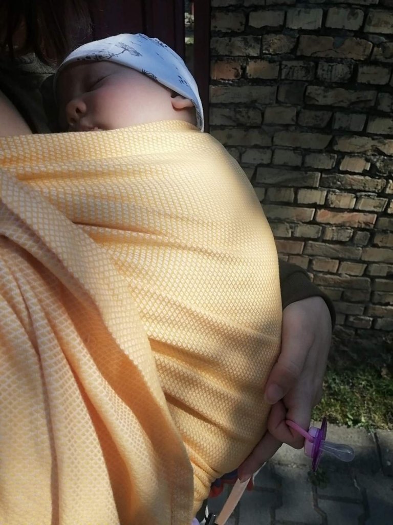 During this period we used it only in house because i needed one more hand to finish everything in the house. I didn’t kinda like it so much because it is hard to go through the rings, but the baby liked it, and it is not so comfy for longer carrying. Anyway it helped me with baby growing tooth’s and being alone with him☺️