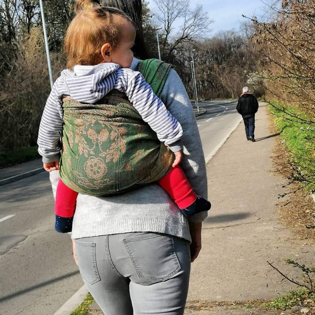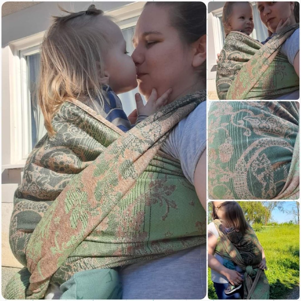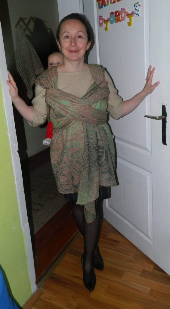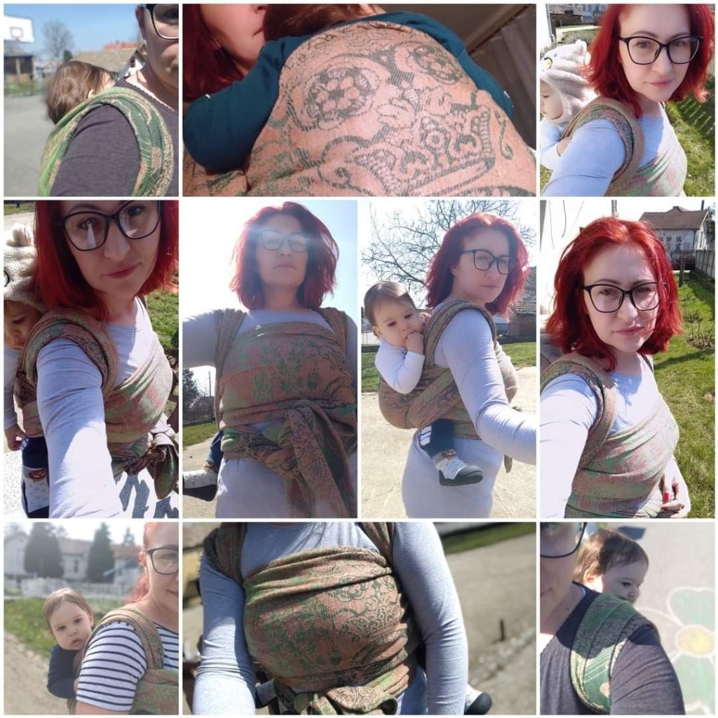 Thanks to Lenine putujuce nosiljke (Lena’s traveling carriers) and Mokosh-wrap I have a chance to try Mokosh wrap Lukomorye, 60% cotton, 35% bourette silk, 5% modal, in size 6. It’s came to me brand new. After watching it was very fluffy and grippy. It was hard to wrap with, but when set up everything stays in place. The wrap looks great, the pattern is interesting, I don’t love green , but I must say this combination colours is very nice. Baby tester is 18 months old and has 12kg. Wrap is so cousy a d comfortable on shoulders. I’m really couries to try it when totally broken.