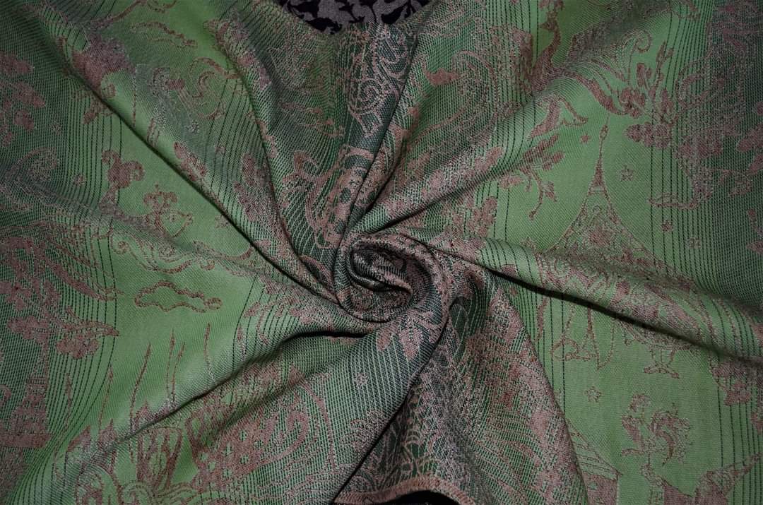 Thanks to Lenine putujuce nosiljke (Lena’s traveling carriers) and Mokosh-wrap I have a chance to try Mokosh wrap Lukomorye, 60% cotton, 35% bourette silk, 5% modal, in size 6. It’s came to me brand new. After watching it was very fluffy and grippy. It was hard to wrap with, but when set up everything stays in place. The wrap looks great, the pattern is interesting, I don’t love green , but I must say this combination colours is very nice. Baby tester is 18 months old and has 12kg. Wrap is so cousy a d comfortable on shoulders. I’m really couries to try it when totally broken.