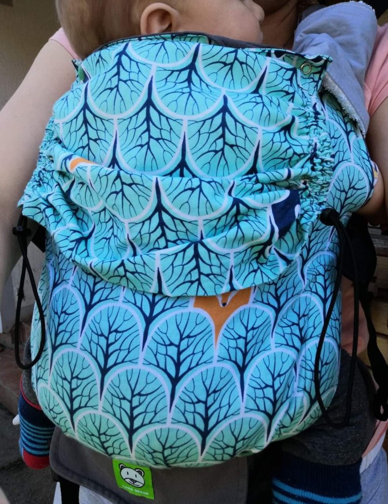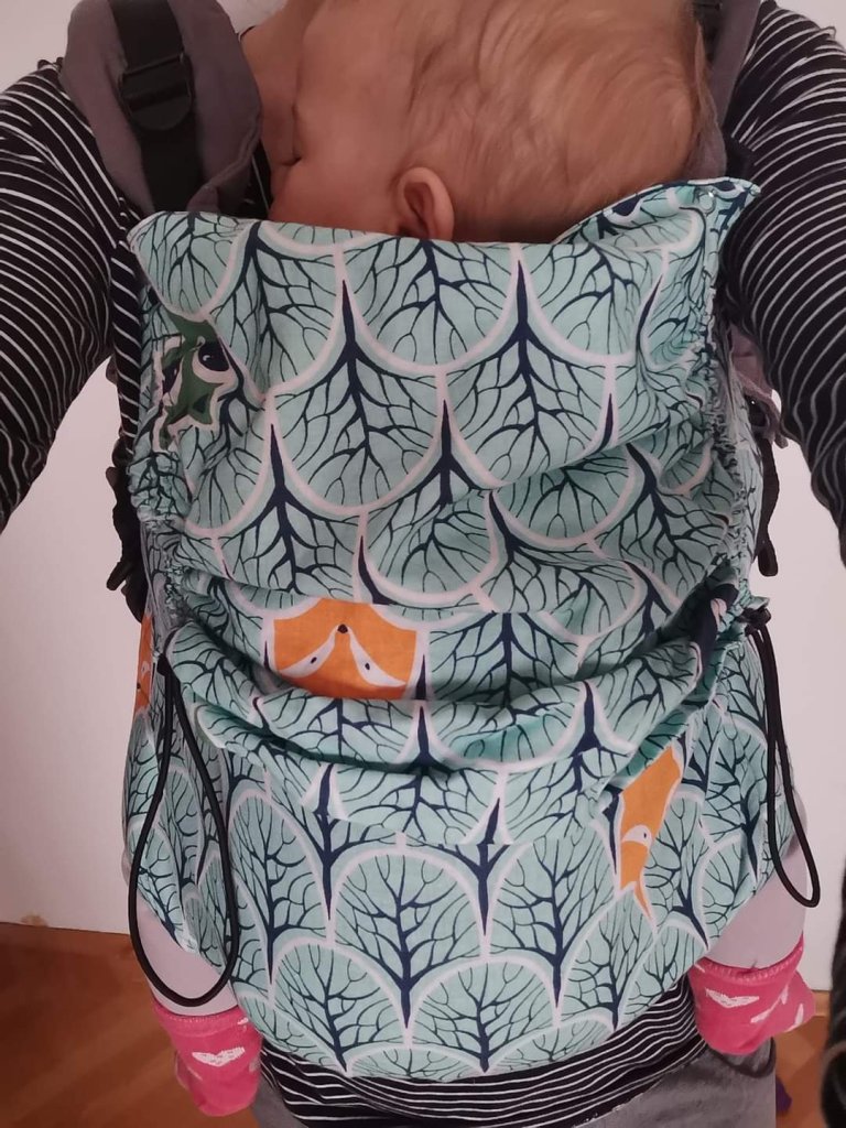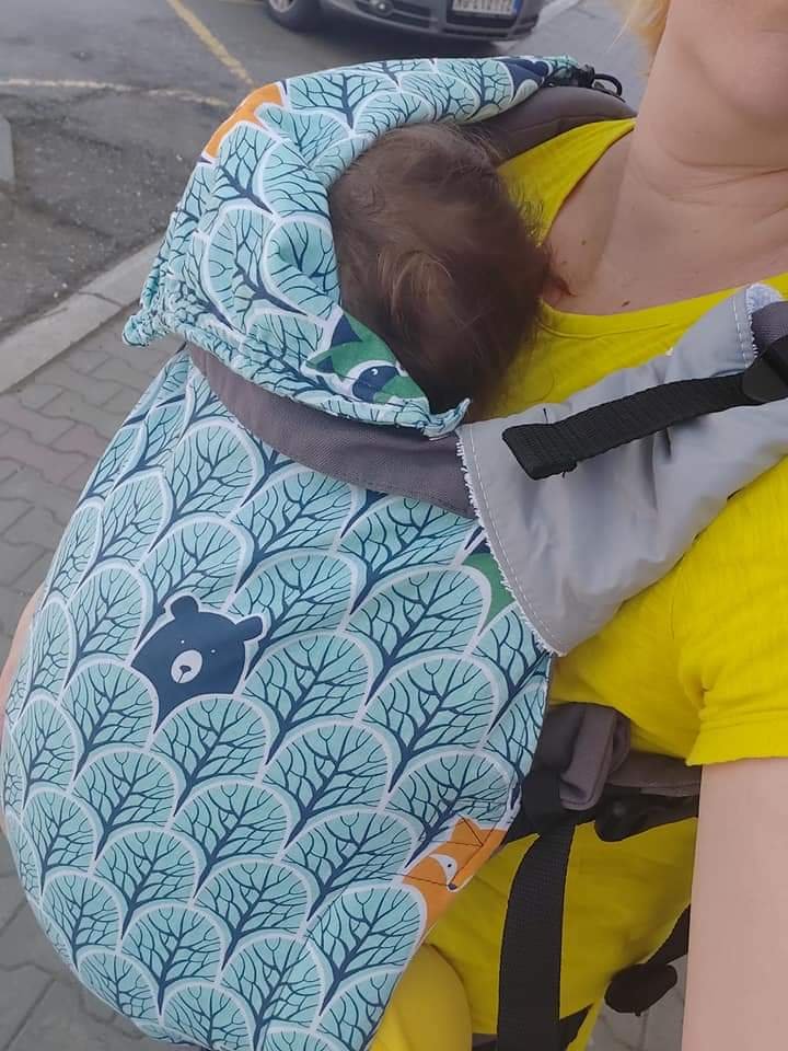 Thanks to Lenine putujuce nosiljke (Lena’s traveling carriers) we had the opportunity to test among first ones this great carrier. It came to us brand new. Pattern is interesting, very childish. It has a strong belt, a bit bulcky for my taste, with a pocket, which can be very useful for cell phone or money. Shoulder pads are tick and very cushy. It has padding on side straps, which are two-ways. Also it has two spots were you can attach shoulder straps, heigher and lower, which is stitched to panel, so when you narrow down the panel, straps are pulled with it. You use it when the baby is smaller. Although it has pfa, panel can be adjusted only in width, not in height, so I would recomend it to bigger babies. Hoody can also be detached. I had a bit problem to pull the straps, but I think it is because the carrier is new, and with using, it will go much easier. Overall, this is one fine carrier.