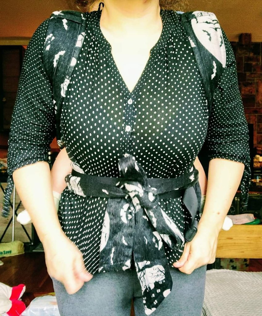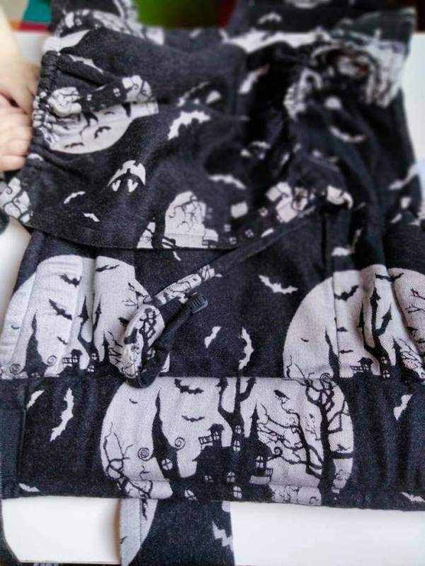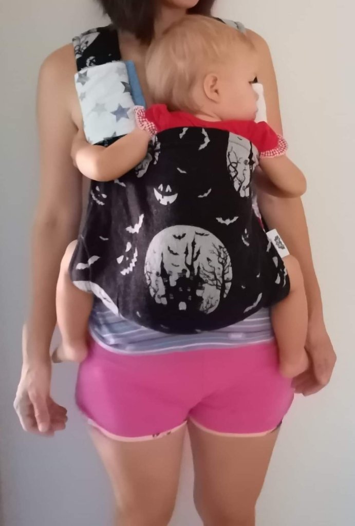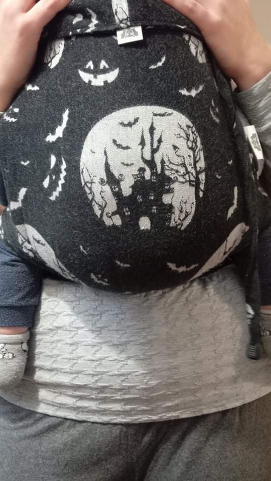 I like halfbuckles, they are usually very comfortable. This carrier doesn’t break the pattern either. Easy to put on and adjust in front and on the back too, has 2 detachable hoods, the belt is firm and gentle enough. The shoulder straps are wide and long enough to place correctly and be comfortable. What I liked the most is the creepy Halloween design and the softness and blankety feeling of the material.