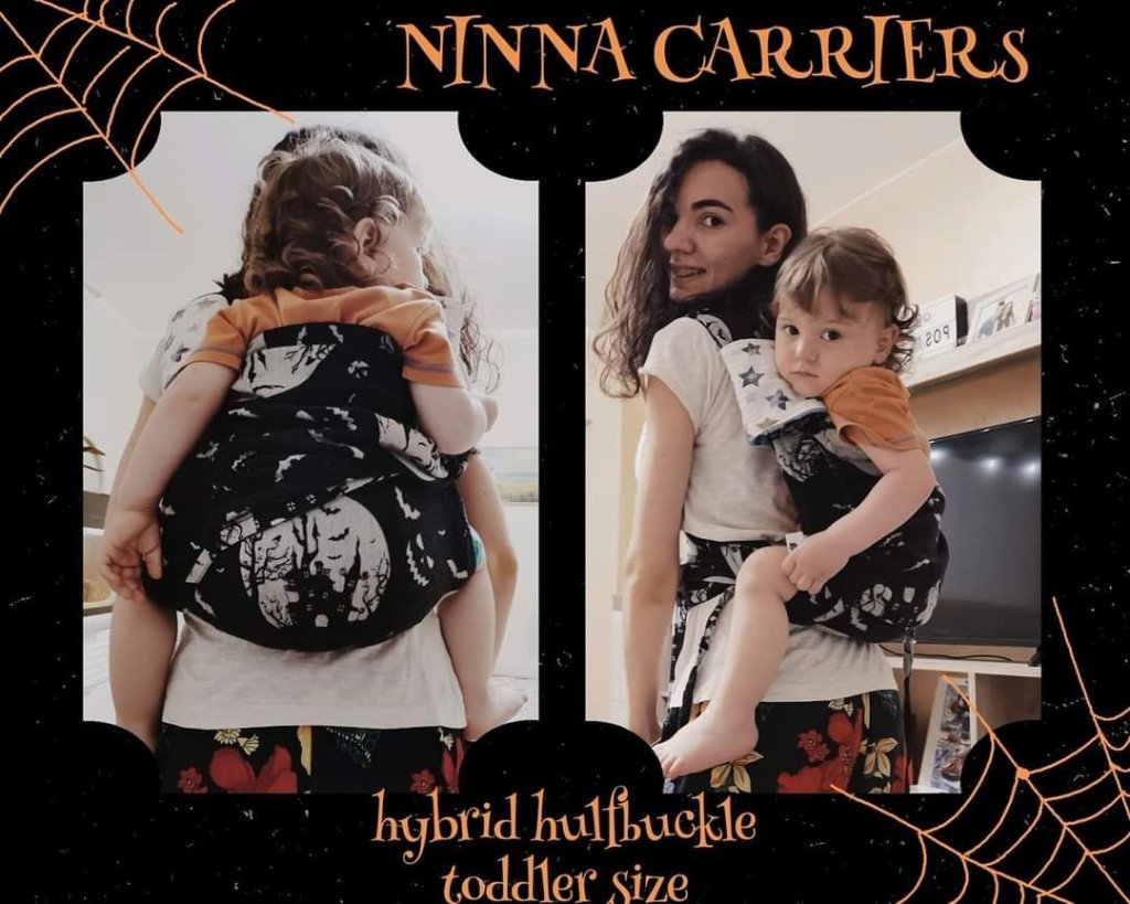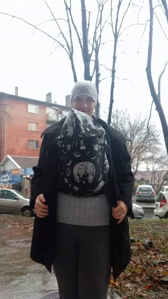 Thanks to the Lenine putujuce nosiljke (Lena’s traveling carriers) and Ninna Carriers we had the opportunity to test Ninna carrier hybrid hulfbuckle in toddler size. Firstly I was amazed by the softness of the material. Design reminds me of the movie “The Nightmare Before Christmas” so I cannot help but hear the soundtrack of the movie when I see the carrier. 😄 Straps are partly so well padded, and the ends are perfectly thin so you finish the knot easily. It has an extra hood so you can use the one that fits your needs. This was our first hybrid hulfbuckle and we managed quickly to set it. I am thin so I felt a bit more pressure on my waist when I carried my boy on my back because of the waistbelt + finish knot on the same place, but for the front wearing there wasn’t a problem. My son has 18months, 10.5kg and wears size 86. Thanks Lena’s traveling carriers and Ninna carriers for this opportunity! 🎃