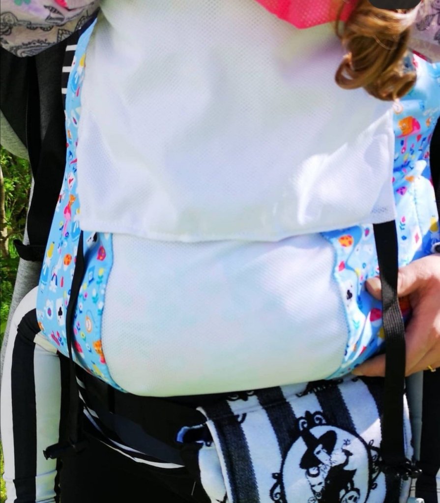 Muslin cloth is very useful in summer and can have multi purpose. You can use it to add aditional cover/shade. But you can also put it between you and baby when front carry to collect extra sweat when baby is especially sleeping or as a cooling addition if you use it wet. There are also specially designed “summer pillow” and “bibs” which can be detached to soft structure carrier with the same purpose.