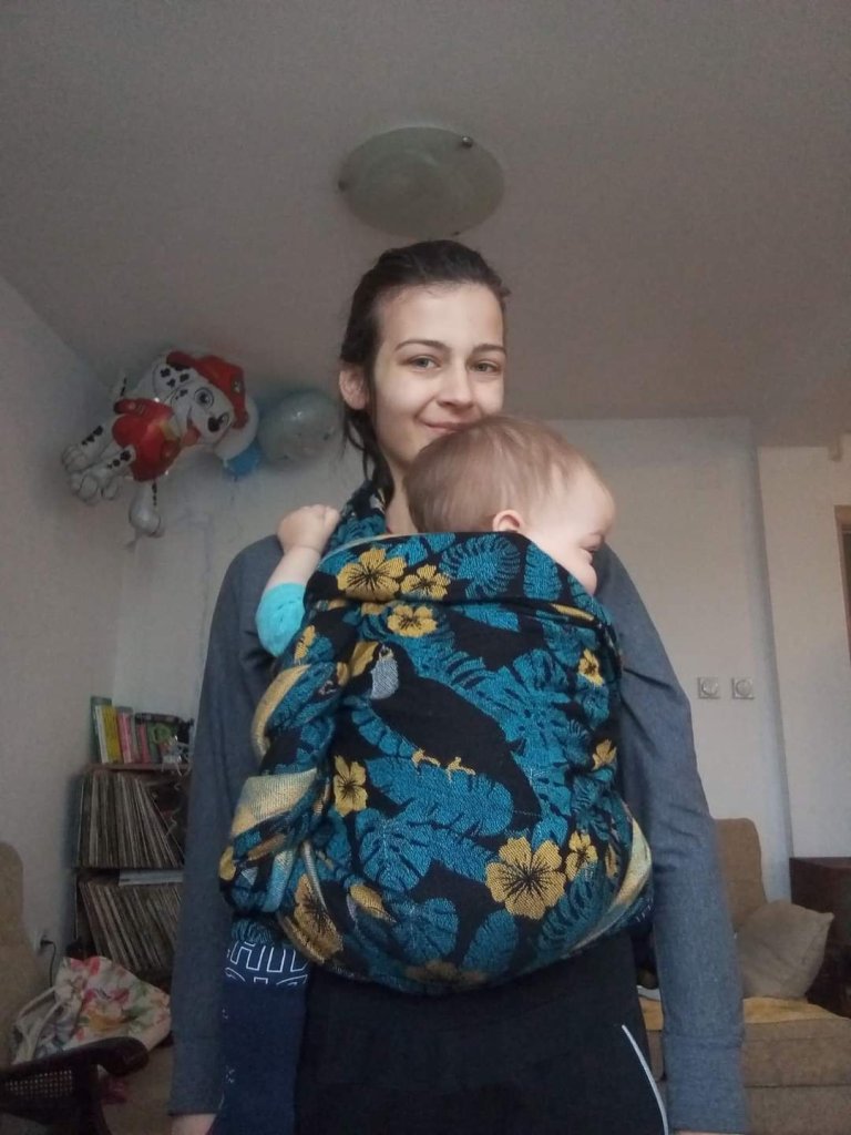 Thanks to Lena’s travelling cartiers I had a chance to try this beauty Lolly wovens Mr Toucan Cool Jungle in size 6. My baby boy is 11 months old and he has 10 kg. It is very soft and moldable and it is not very thick, it’s just perfect for us. My colour is black so it has a perfect design for me. We really enjoyed hugging ❤