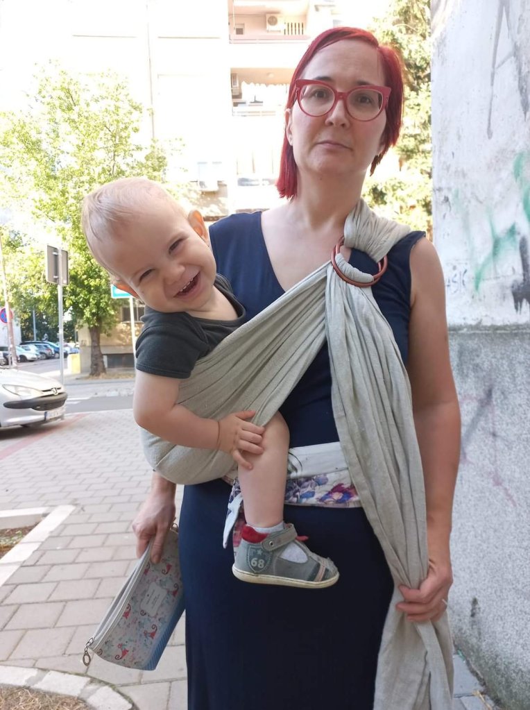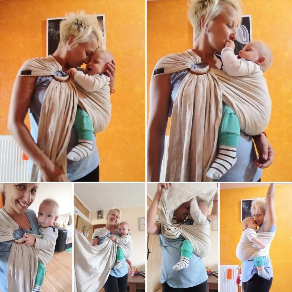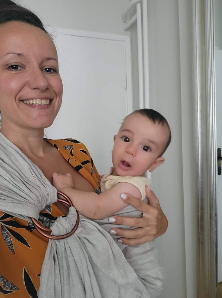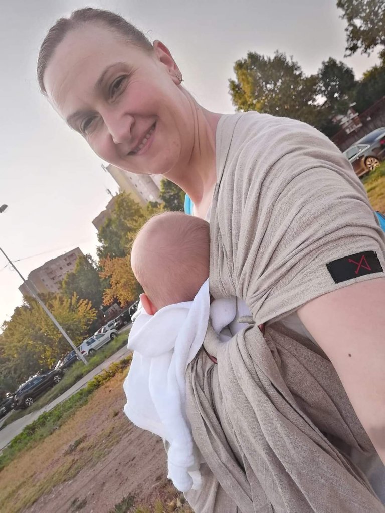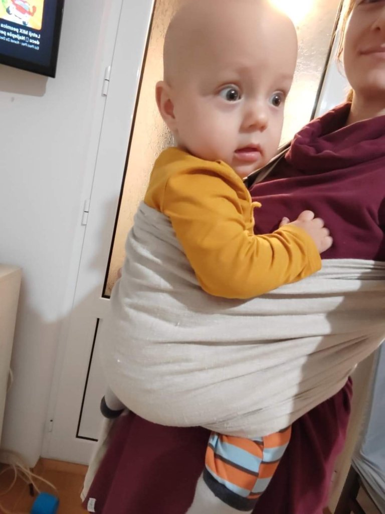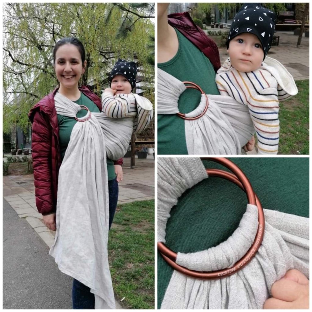 Thanks to Lenine putujuce nosiljke (Lena’s traveling carriers) and DracoMom Carriers doo we had the opportunity to try this linen ring sling. Considering that this is our first encounter with a ring sling, not counting the first failed attempt when the baby was only 2 months old, I am satisfied with the speed with which we were able to mount it and that very successfully. Quick and easy assembly, 14-month-old boy mostly with a smile on his face when we wear it, the material is great for summer (we wore it even at +30°C), and we don’t need anything more than this. We’ve been wearing it on our hips, and I sometimes have trouble getting the rings in just the right place, but it’s getting better every time. A little more practice with mounting and I think this will be an ideal carrier for us, for short walks mainly because the boy is growing and getting heavier, and thus the pressure on his shoulder, and he wants to walk more and explore everything around him. Baby tester 14 months, about 11 kg. I recommend that you definitely try it. I thought that I would never be able to mount it, but here we have mastered it 😉
