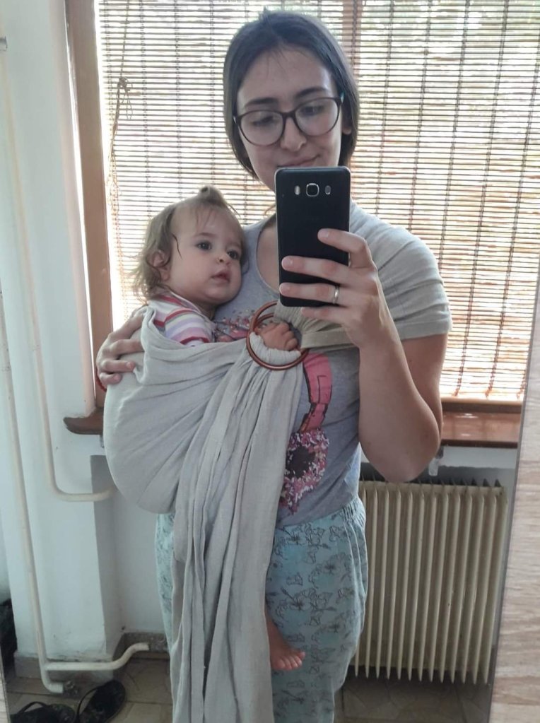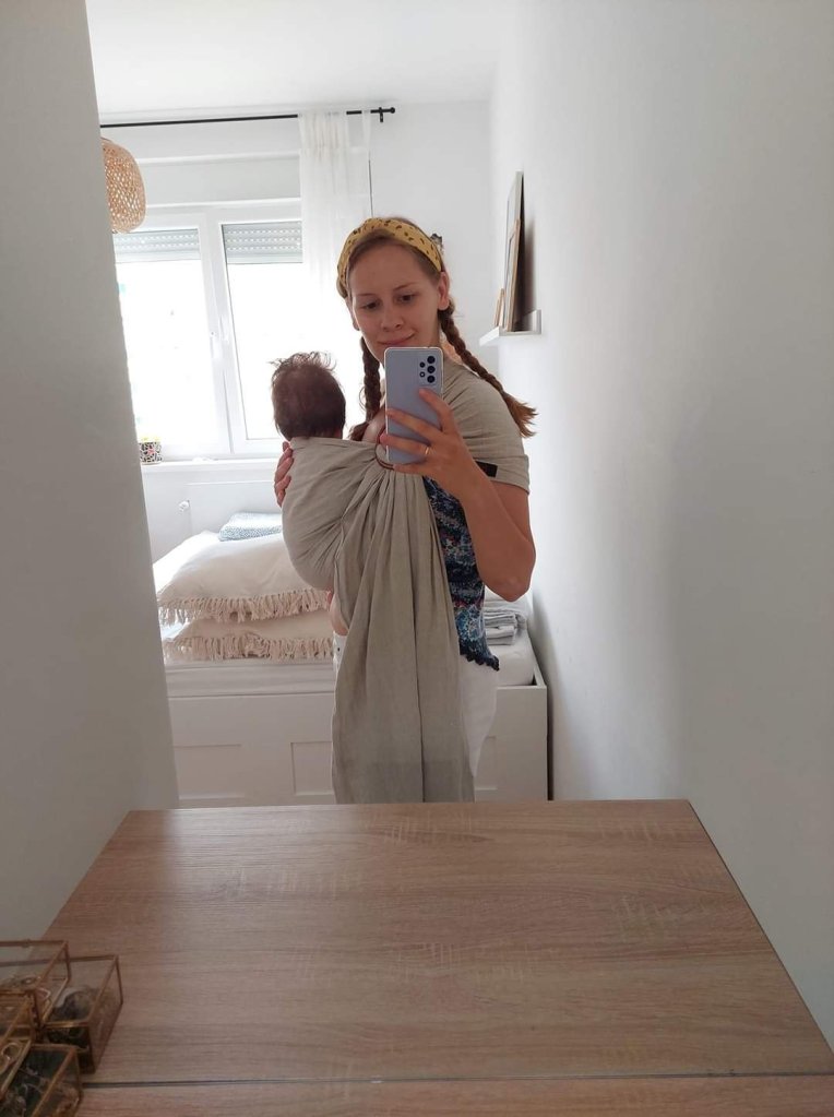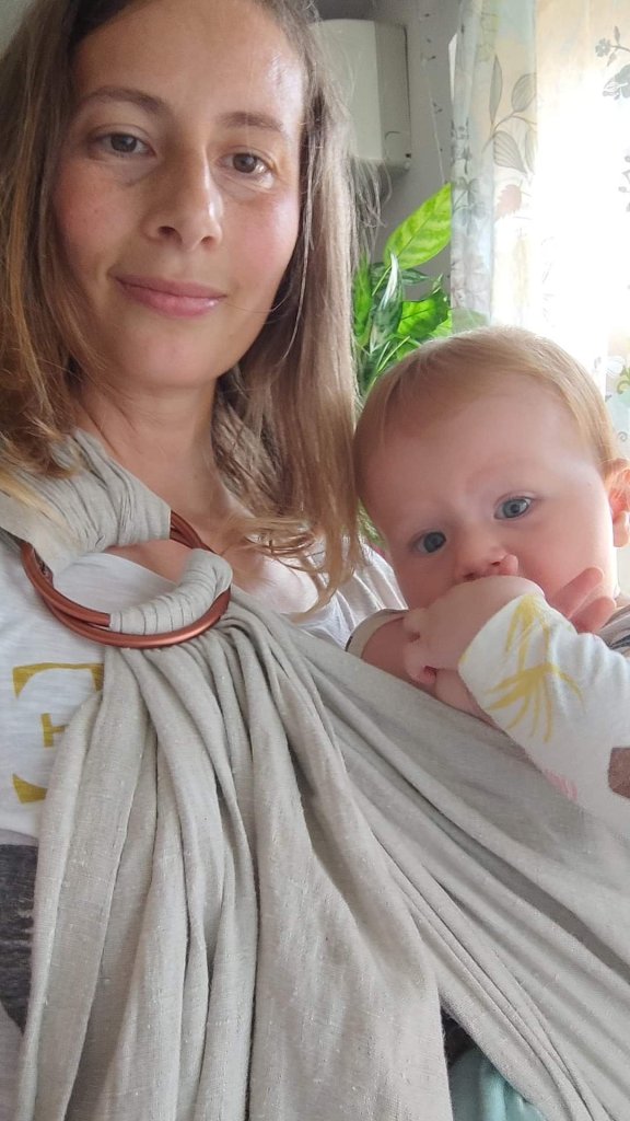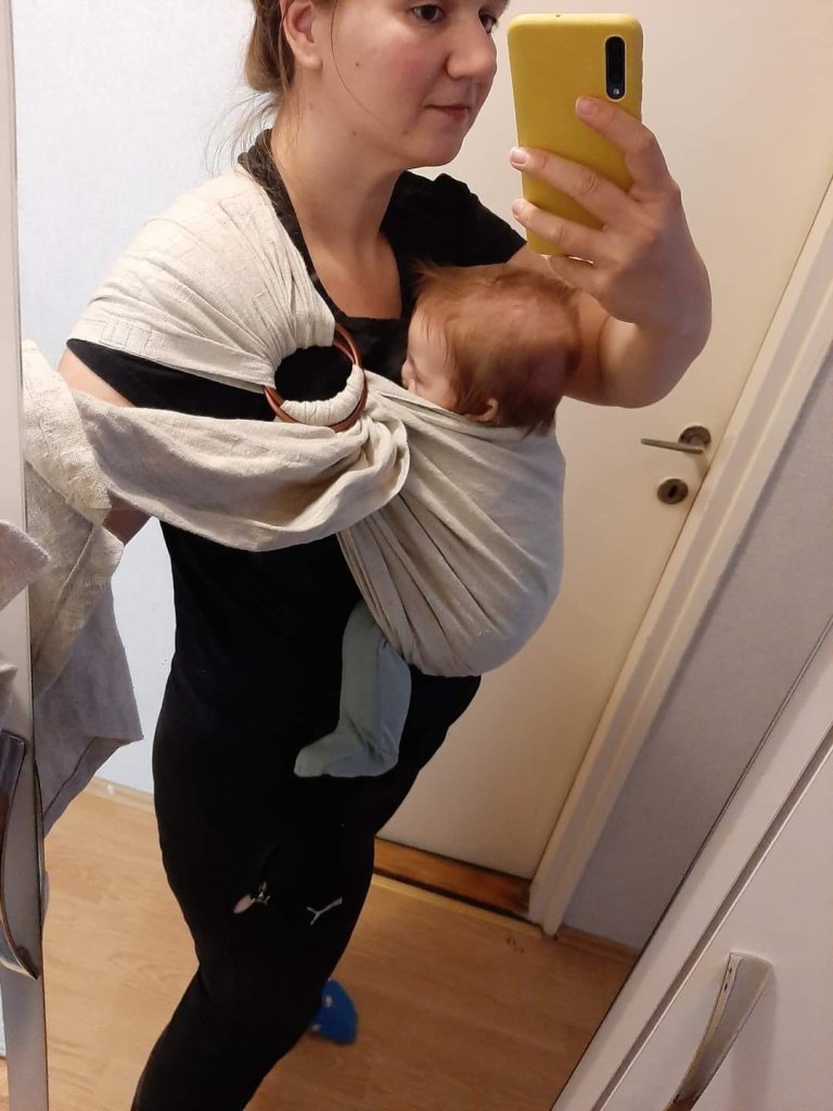 Thanks to Lenine putujuce nosiljke (Lena’s traveling carriers) and DracoMom Carriers doo , we have tested beautiful lanen ring sling during December/January. First of all, fabric is awesome. This ring sling is so elegant, I could imagine us wearing it to some really nice place 🥰 So far, we are using elastic wrap, so this is something new for us. First, I was a little bit sceptical due to lack of more material between legs for support, but that’s just practice and getting used to it. We have been using it mostly at home and Lenka really liked it. With a little bit of practice, it was really easy and quick to set it.