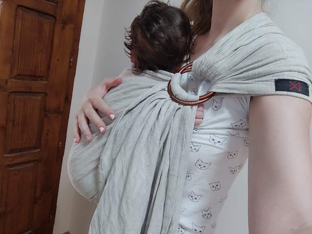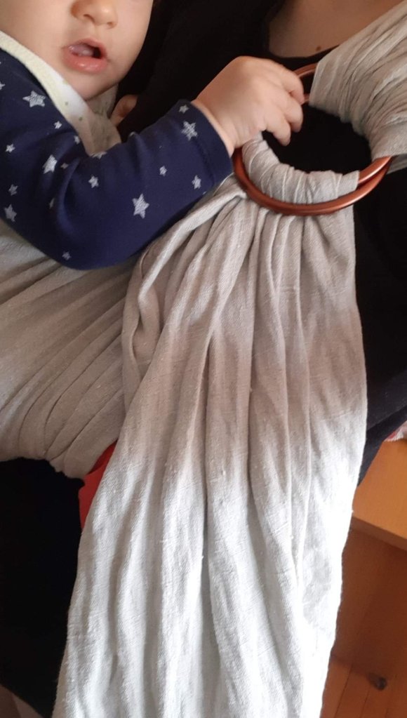 The baby weighs 11 m and 9.5 kg and I did not feel her weight. This linen ring sling is beautiful but I have to admit that I am more of a carrier person 🙂