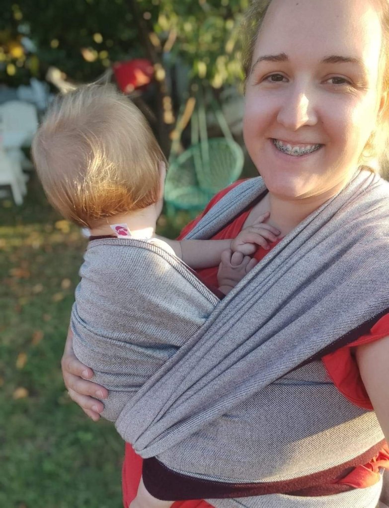 Baby tester was 6 months old and about 8kgs at the moment. Colour perfectly blend in autumn colours, and we wore it on both sides. We truly like it and enjoyed wearing it.