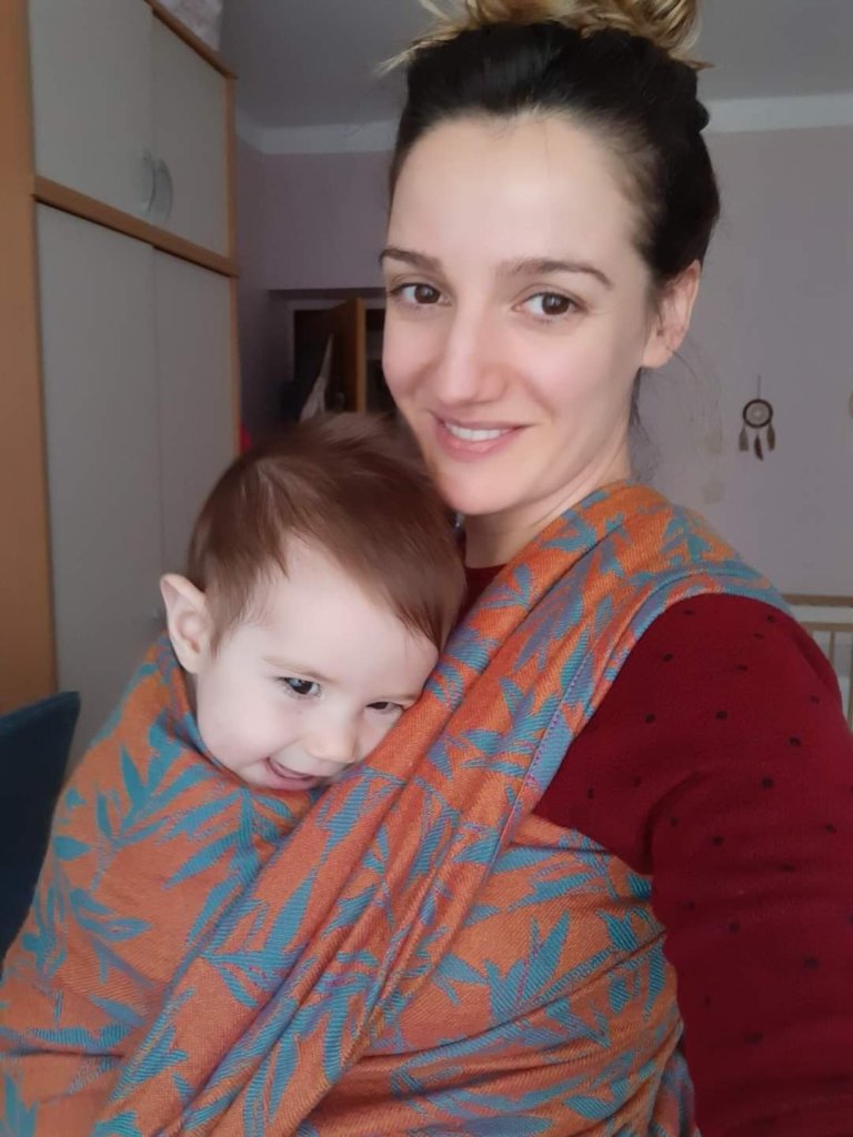 Thanks to Lenine putujuce nosiljke (Lena’s traveling carriers) and Kenhuru Sling I had the opportunity to test kenhuru olive Rocco woven vrap in size 6 and I fell in love at first sight. When I touched it, I loved it even more. It is so soft and fluffy, but at the same time very supportive, and the wool in it didn’t pick at all. And it’s beautiful colour cannot be shown in pictures. Tester is two and a half years old and around 12,5 kg weight and wrap held him perfectly. Thanks again for this great opportunity 🧡💙❤️