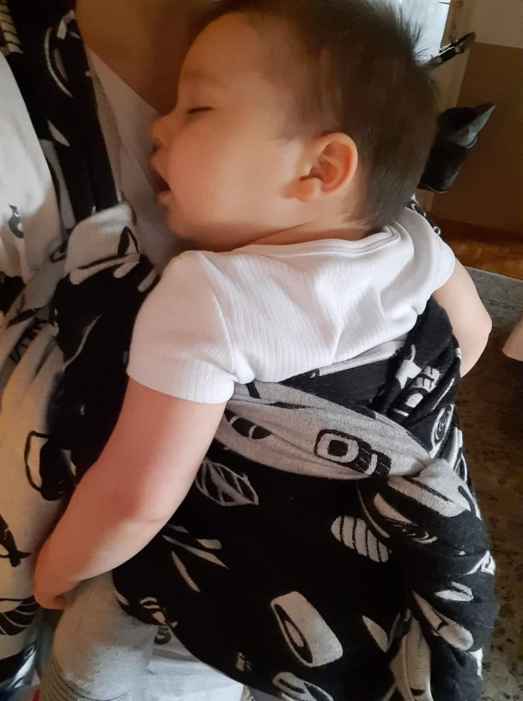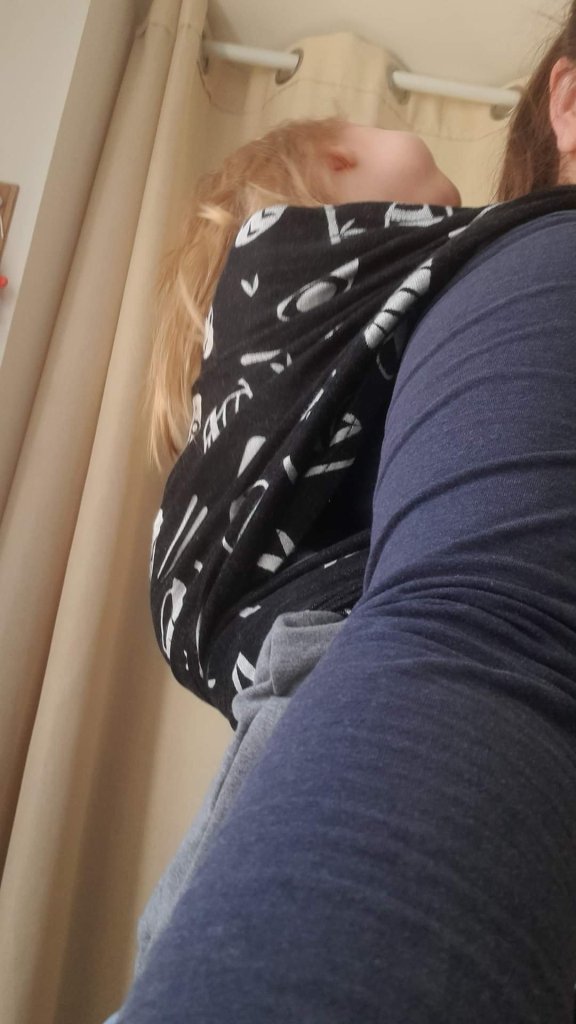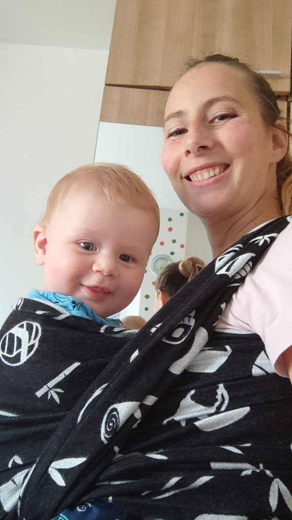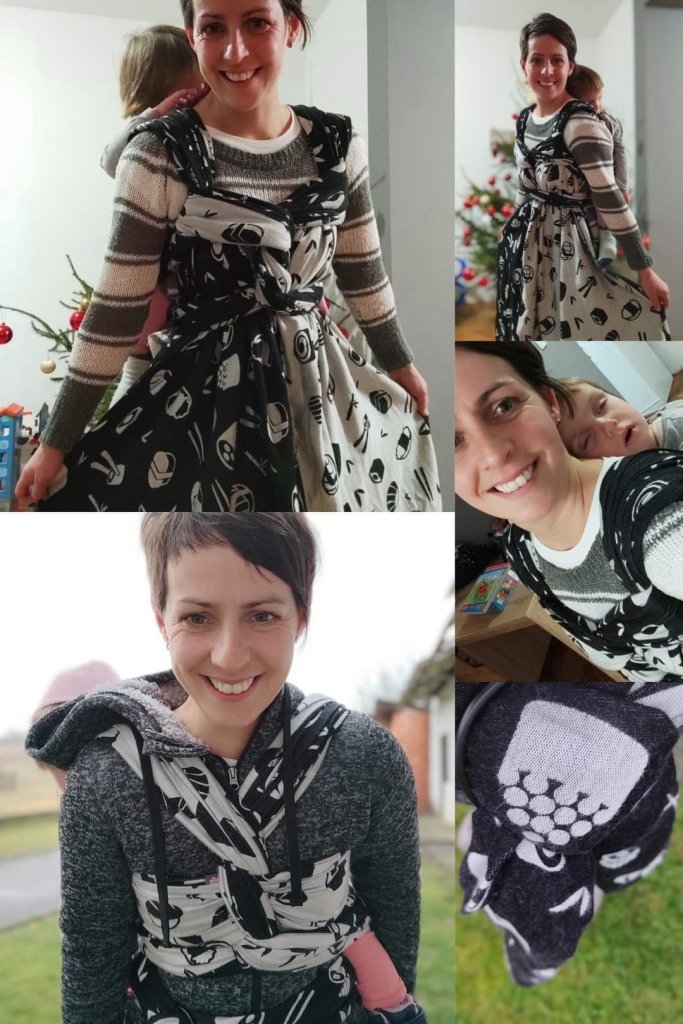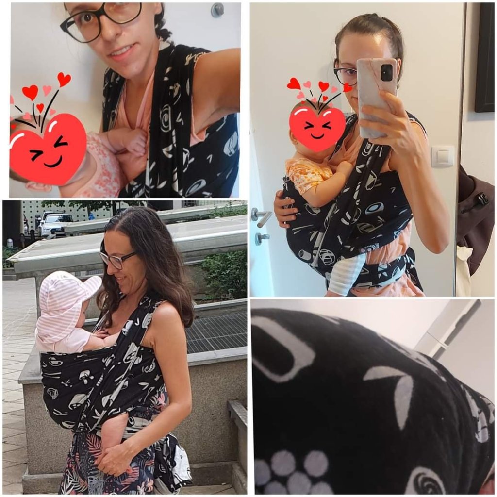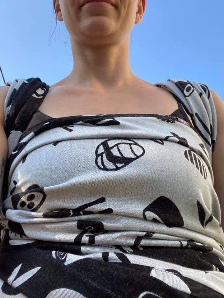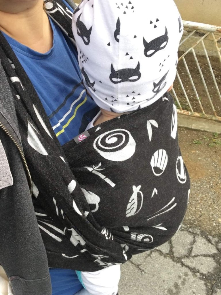 This is a very interesting wrap, my first encounter with a modal blend. A bit slippery in hand and glidy at first wrapping, but it holds this 9 months/10kg bouncy baby very nicely. It is comfortable and the monochrome pattern looks so nice on pictures, since it has two very contrasting sides. The size is my base size +1, so we had lots of material to play with, but the knots weren’t bulky and the wrap is not heavy so it was a great experience.