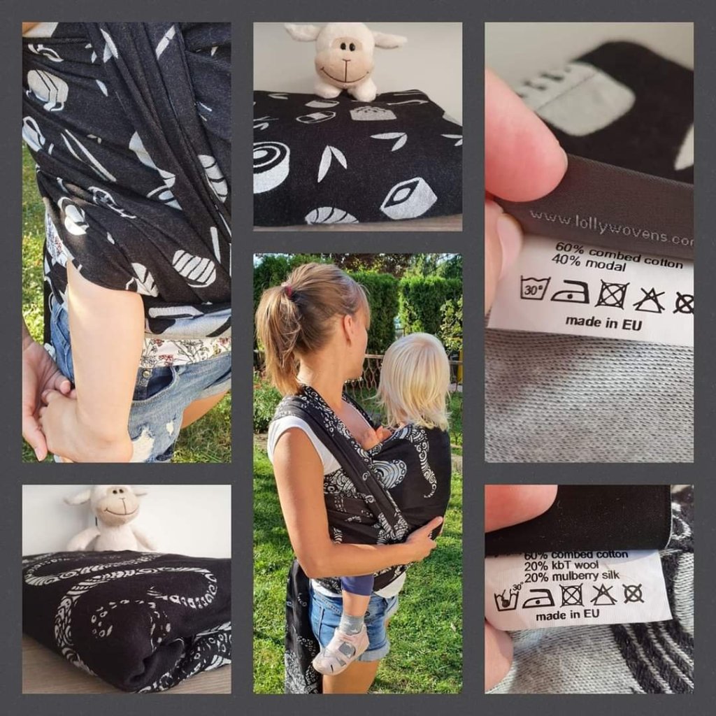 I had the opportunity to test two Lolly wraps at the same time, Butterfly Spicy Evening (size 6, 60% cotton, 40% bamboo, 270gsm) and Sushi Monochrome (size 6, 60% combed cotton. 40% modal, 270gsm). I liked those butterflies a little more than sushi because it has more texture, I had a feeling it was easier for me to set it up than sushi. It even seemed to me that the sushi was a much longer size 6, although they should be the same length. Sushi is closer to me because of the colours and it is really an extremely soft scarf, but I have to be honest and say that I still preferred to reach for butterflies… Both wraps are really soft and gentle, easy to wrap… Maybe not so good choice for hot summer days, but still very very nice wraps with a handful sleeping dust..:) #lollywovenstester, #lollywovensincroatia #testerinosiljkihrvatska