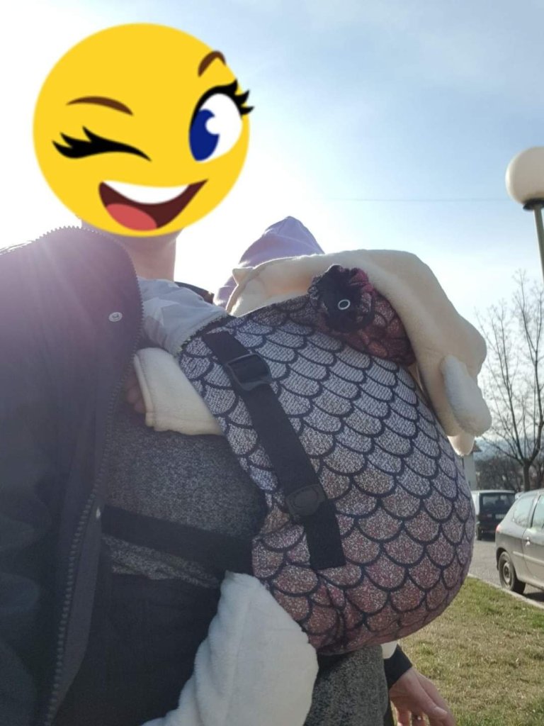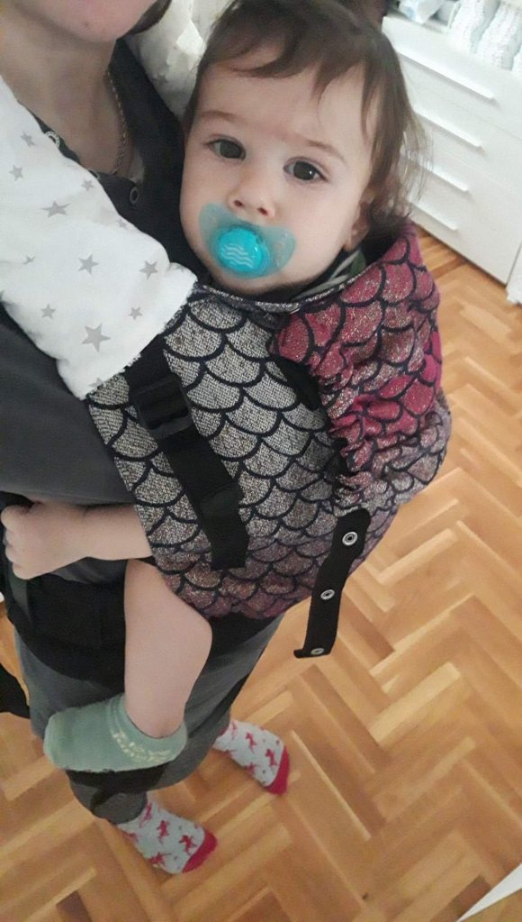 Thanks to Lenine putujuce nosiljke (Lena’s travelig carriers) and DracoMom carriers doo we tried this wonderful carrier. Baby is 10m old and 9kg weighs. This carrier is easy to use. Material is so soft and mermaid design is beautiful. The straps are extremely comfortable and belt is easy to tighten. This is just the perfect carrier to me and I would recomended it to evryone.