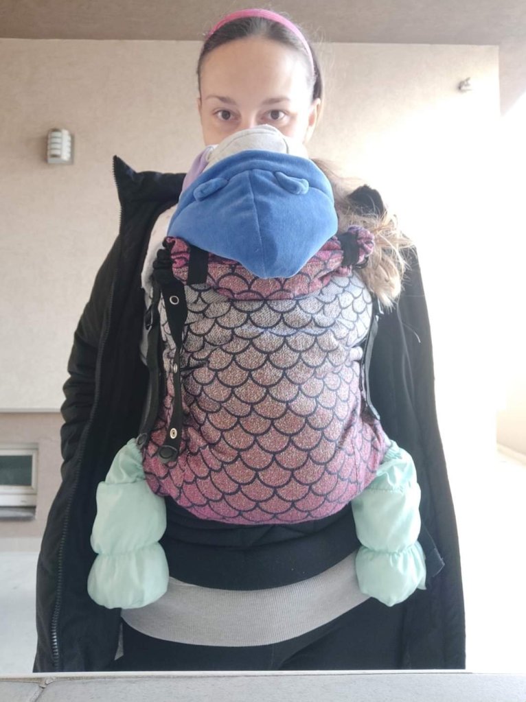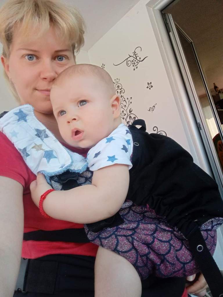 After reading about all the different types of carriers, I decided to try and test the DracoMom baby-size Mermaid Summer Eclipse. My baby is 2.5 months old and weighs 7 kg. We had a few comfortable walks, my back didn’t hurt, and the baby slept almost all the time. Thank you, Lena’s traveling carriers!
