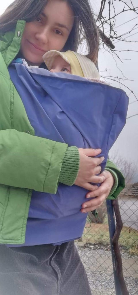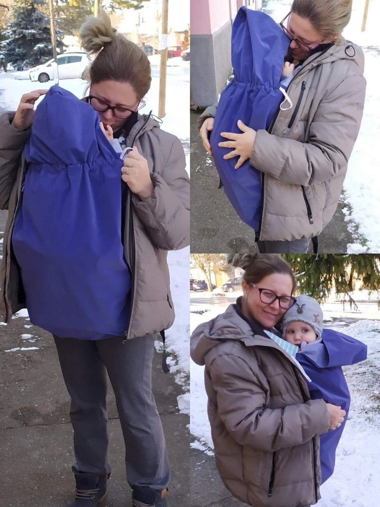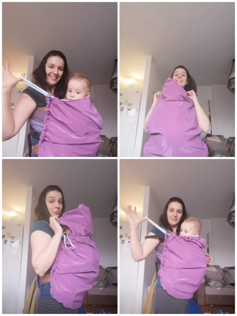 This rain babywearing cover from Anđelčić Kreativna Radionica is so useful for these spring days when the weather is changeable. The color is very pretty and shiny because of the material. We already have winter cover and we are familiar with the principle of setting up.