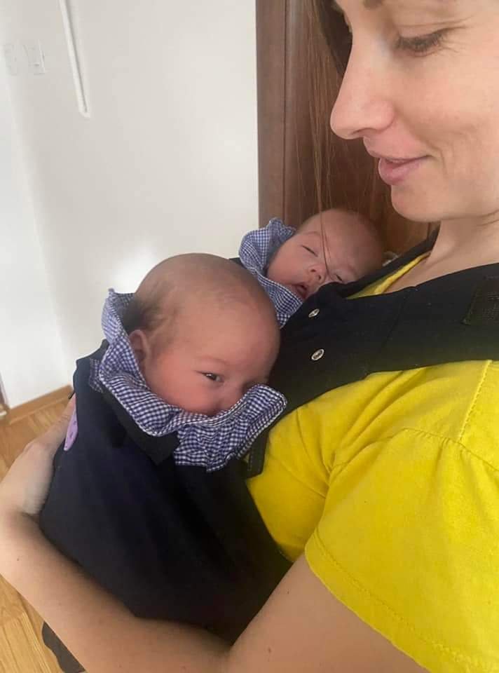 I was pleasantly surprised to discover that there was a baby carrier for twins. When you manage to place babies safaly in, the experience is unique, because you can be together for a long time. The problem can arise because the baby legs has to go over one an other in the middle, and the heads can collide when babies catch sleep, because they are too close to each other.