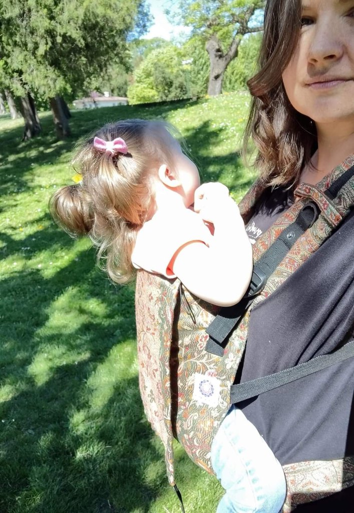 Thanks to Lenine putujuce nosiljke (Lena’s traveling carriers) and the babywearing meeting they organized this sunny Monday in Belgrade, and of course thanks to Almitra Tattva- Babywearing Art Studio we had a chance to test this great full buckle soft structured carrier Henna Yoga Baby Carrier- Cashmere Collection. My baby is 2y 4m old, around 11kg and a bit petite so it fit us ok even though it is baby size. The panel is adjustable in height and width, not the usual way of adjustment that I’ve used so far, but it’s probably like that in order not to ruin the nice soft material, cashmere and wool, with velcro or similar. The shoulder straps are nicely padded, the belt holds nicely and doesn’t bend even though not as firm as I am used to. What I like the most with all almitra products are the colours and the ethno/boho/hippie design, which have always been my all time favourite. Thanks once again for this wonderful opportunity 🤎🤎🤎