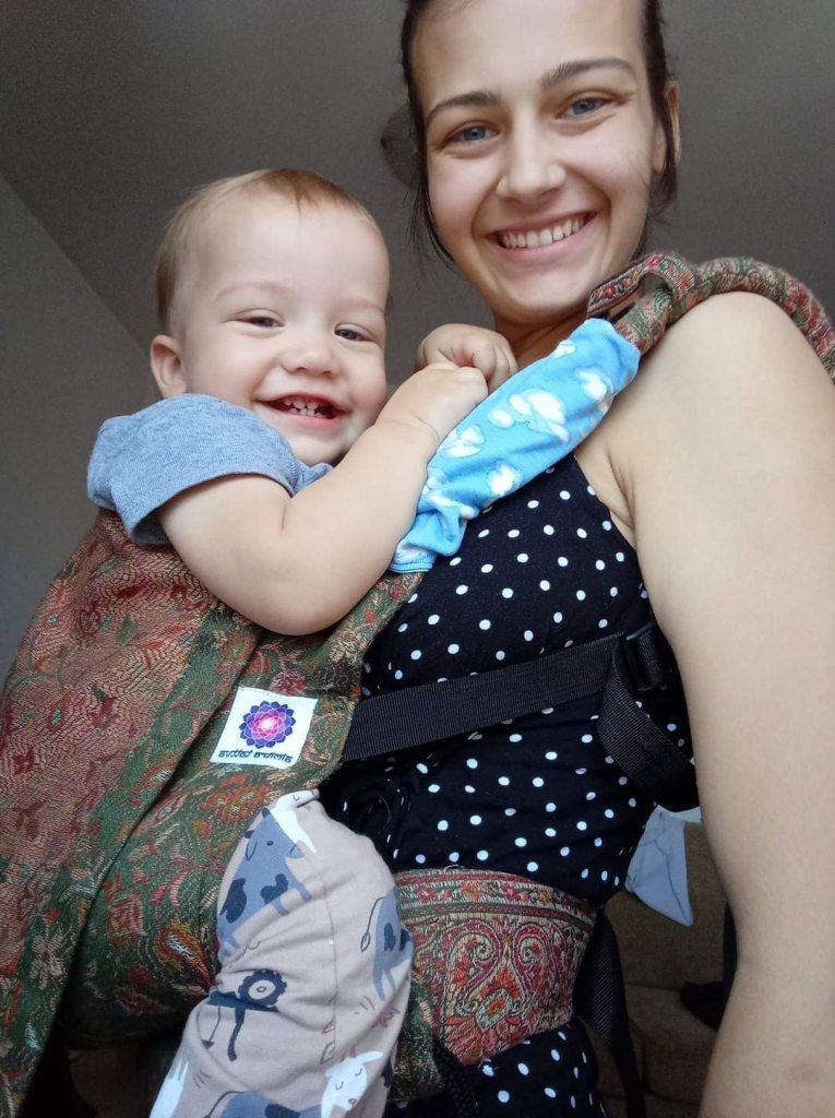I want to thank Lenine putujuce nosiljke (Lena’s traveling carriers) and Almitra Tattva- Babywearing Art Studio for the opportunity to test this full buckle Henna Yoga carrier in baby size. It’s 100% wool (85% merino wool, 15% cashmere) and it’s very soft. At the moment of testing my baby was 13m, 10kg and 80cm. It was a bit too small in width for him. I like how adjustable it is. Shoulder straps are nice patted, but the belt kept twisting. I prefer parallel shoulder straps, but they can be crossed if you would like. It also gives you hip carring option. We enjoyed testing this SSC.