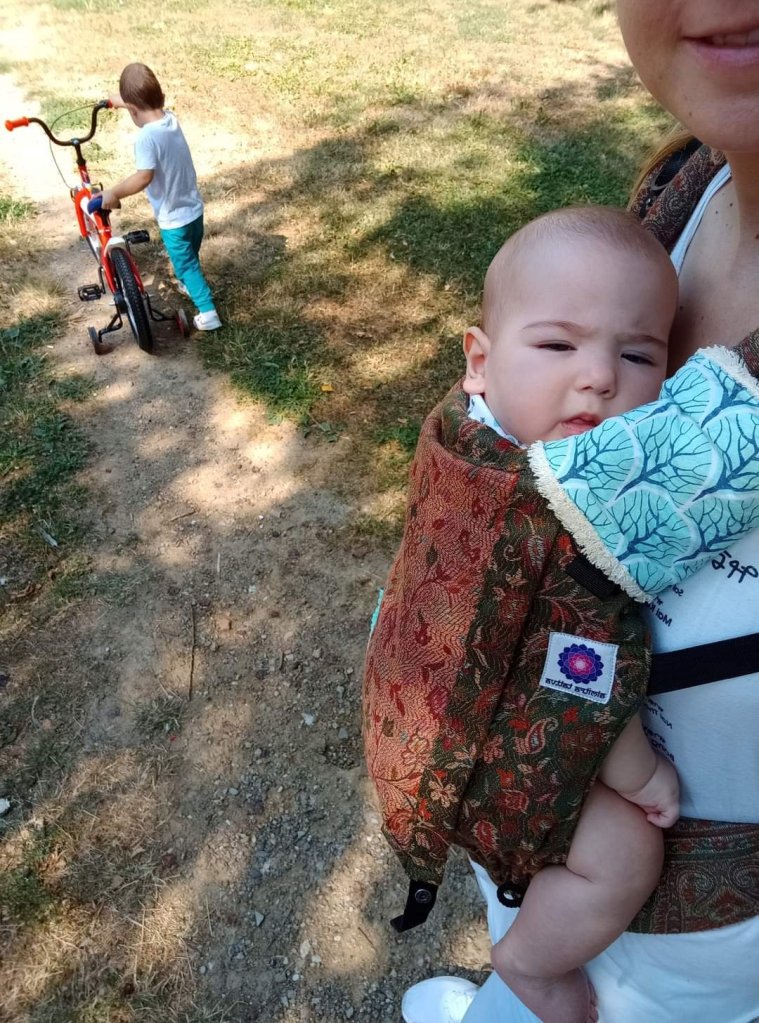 thanks to Lenine putujuce nosiljke (Lena’s traveling carriers) and Almitra Tattva- Babywearing Art Studio i had the opportunity to try this perfect carrier. this time I tried with two babies, my two-year-old Vukan and my little girl Tamara, who is only 4 months old and weighs about 6 kg. In addition to me, the godmother also tried to carry her child, nurse her and put her to sleep. I’m so happy that we tried this carrier and with a heavy heart we sent it on for testing.