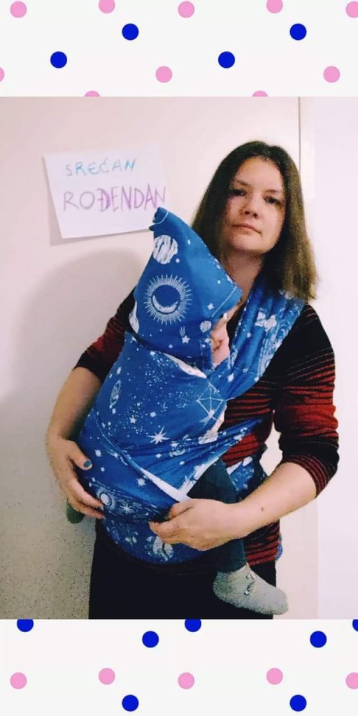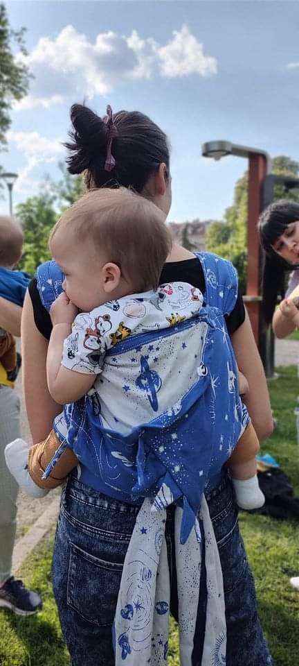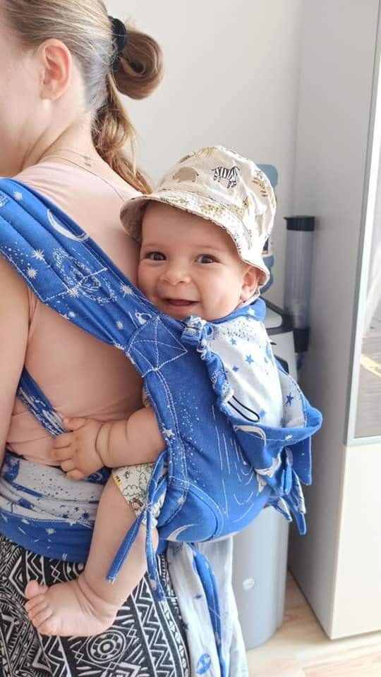 Thanks to a babywearing meeting that Lenine putujuce nosiljke (Lena’s traveling carriers) organized and the donation of Elna carriers to our library I had the opportunity to test this half buckle carrier, baby size, planets blue. My baby is 5 months old and 5.5 kg, we tried front carrying only. It is very easy to put on, the shoulder straps are nicely padded, the belt is firm and comfortable and I really liked the colour and the planets too. The material is soft and durable. I recommend this carrier for smaller babies and toddlers too.