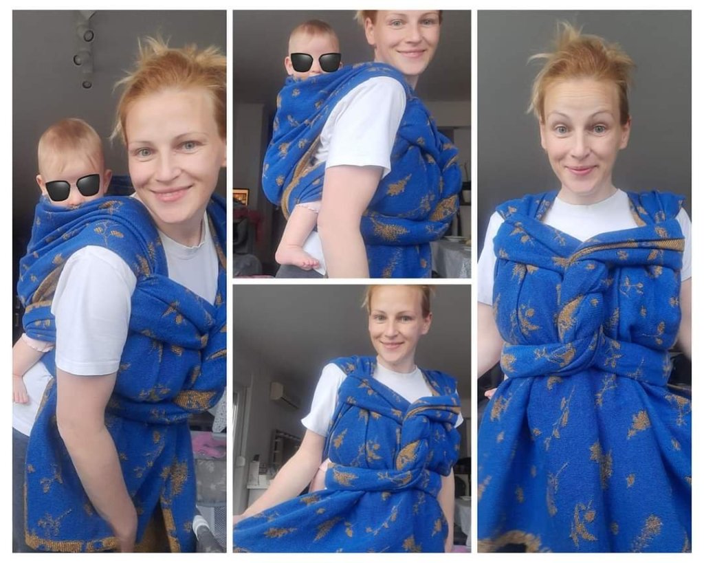 Thanks to Lena’s traveling carriers and Luluna slings I had the opportunity to test Luluna Golden Herbs woven wrap in size 7. This wrap was comfortable and supportive for my toddler, cushy on the shoulders. It is among thicker wraps with but ballanced with little more glide. Due to the type of weft, it is quite easy to make pulls and also I liked more blue side.