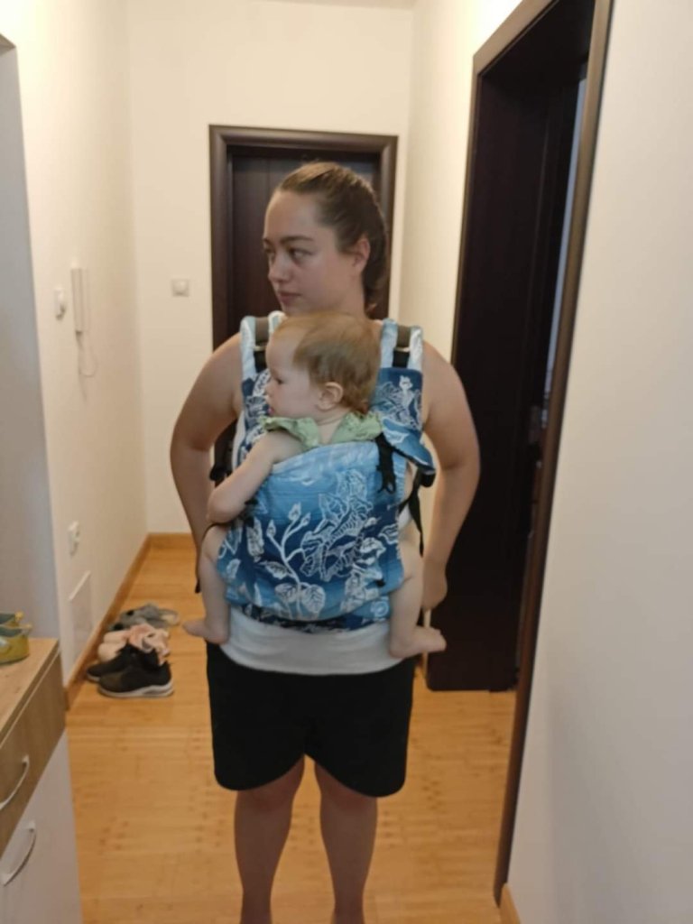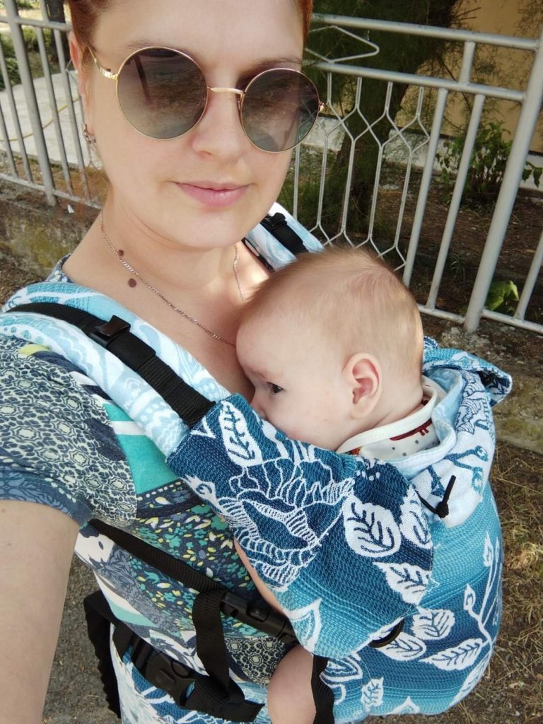 Thanks to Lenine putujuce nosiljke (Lena’s traveling carriers) and MoniLu We had a chance to try this beautiful carrier. The color and material captivated us at first sight and touch. Unfortunately, we didn’t have full sport on knees and my baby didn’t like that very much. Also, we’re not used to this kind of buckle, so it was weird for us, too, so we had to set ourself up with the help of dad. We’re sorry we didn’t get a chance to try this carrier when the baby was smaller, I believe it would have been perfect. The girl is one year old and about nine kilograms at the time of testing.