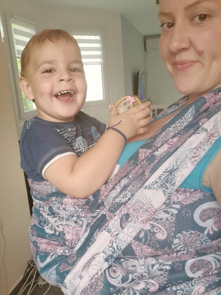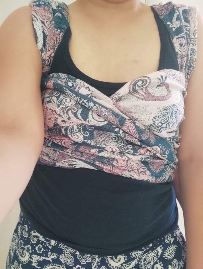 This wrap is really amazing! Peacock Trinity in Rose/Petrol… Peculiar design, interesting colorway… The blend of cotton (70%), modal (20%) and linen (10%) is very nice, soft, comfortable, moldable, yet grippy enough for this 11kg bouncy toddler.