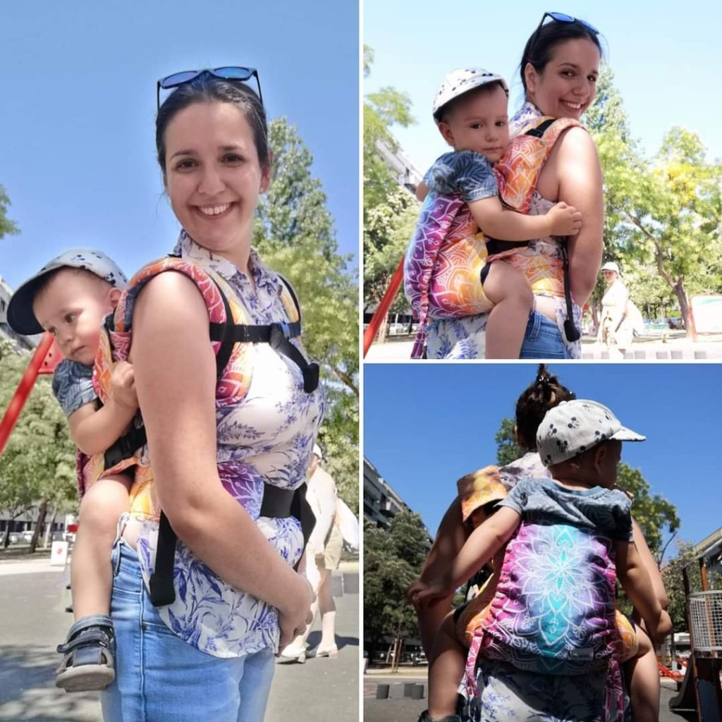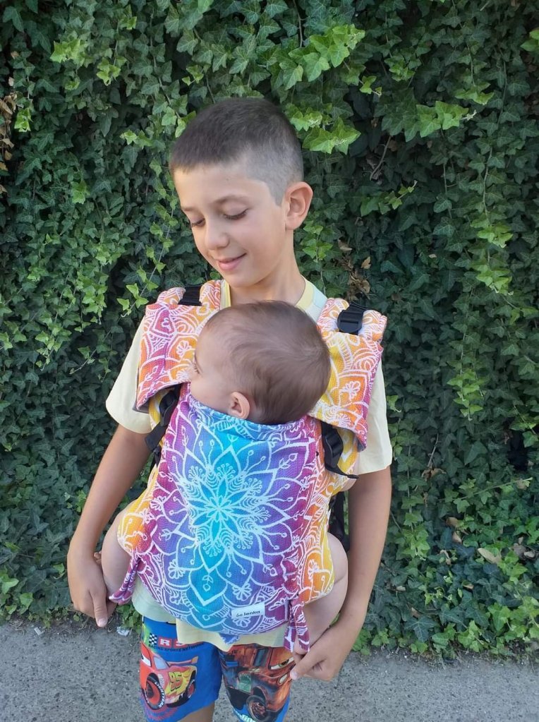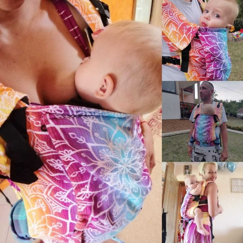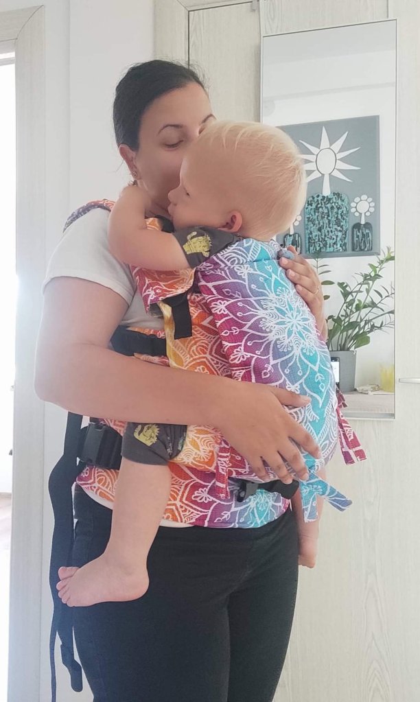 Thanks to Lenine putujuce nosiljke (Lena’s traveling carriers) , we had the opportunity to try this carrier Belenka mini mandala night baby size. The pattern is a crossover and I liked the material, the material is soft and adapts to the baby and the wearer, but it’s not for summer because it’s thicker. The panel can be adjusted in height, the belt is soft and firm enough at the same time, the shoulder straps are soft but wider, which did not suit me. I don’t like that the cross strap is too high almost under the neck if I carry the child on my back and if it is tightened all the way it pushes at the pfa. We were only carried on our backs, the baby tester was 14 and a half months old and weighed about 11 kg