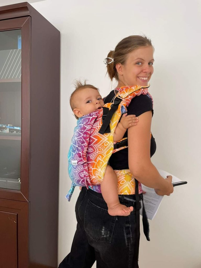 A beautiful carrier that we tested thanks to Lena’s traveling carriers. The design and softness of the material blew me away! The carrier has a comfortable belt and shoulder straps. The panel is adjustable in both width and height, so it could be used for a long time. I would recommend this carrier to anyone interested in babywearing.