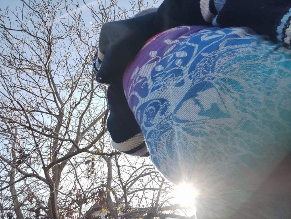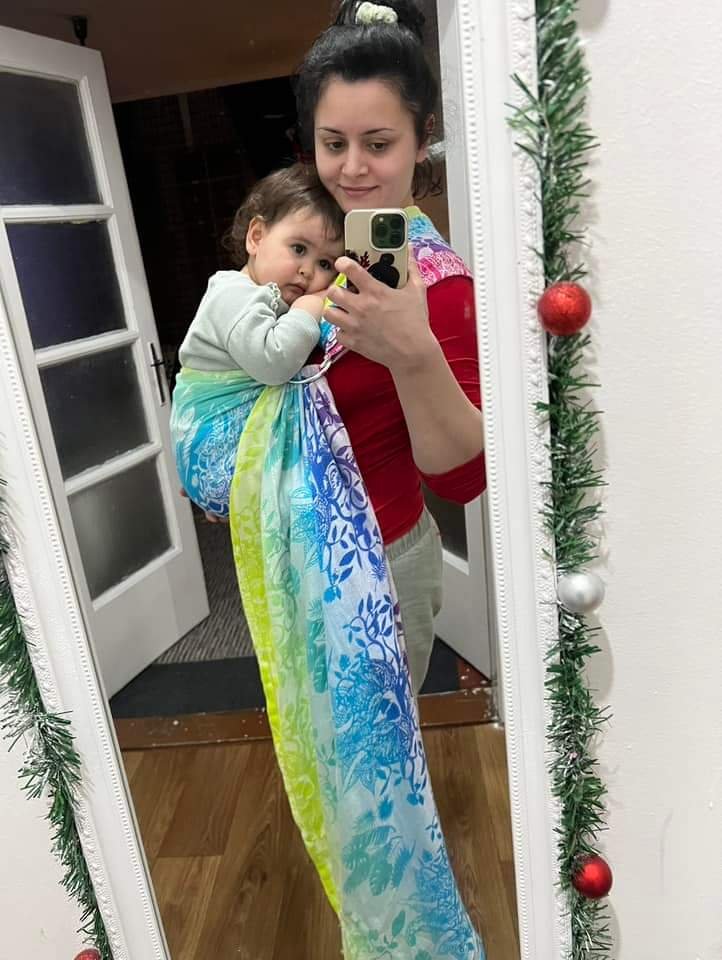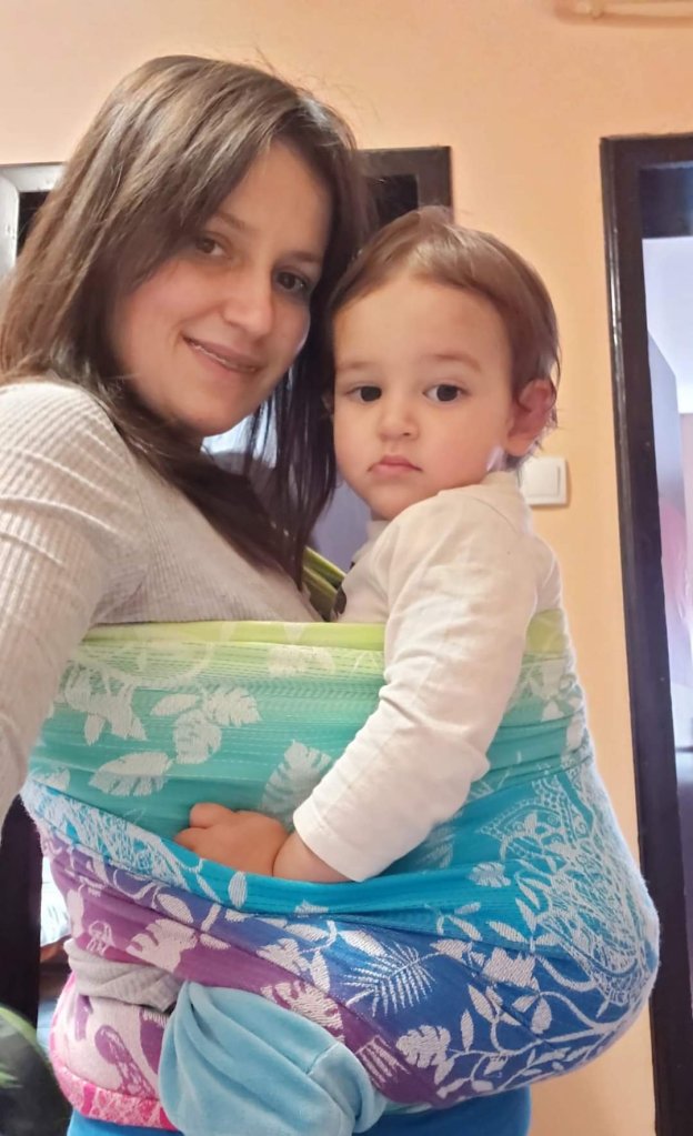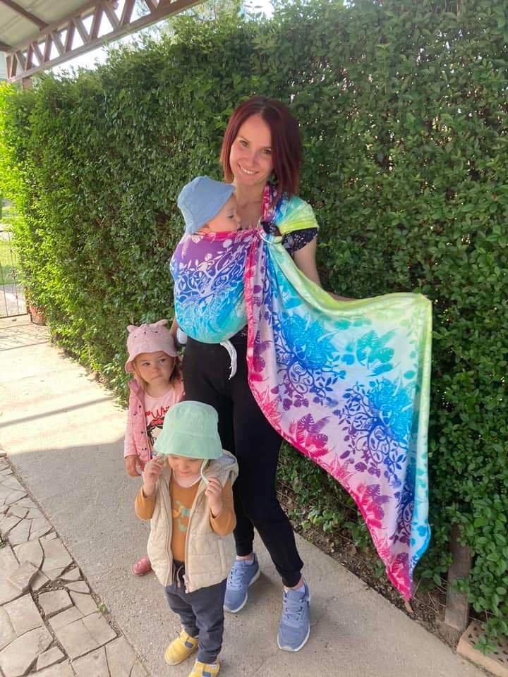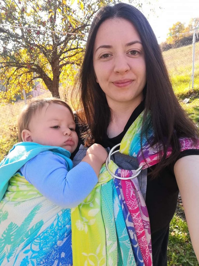 Thank you Lenine putujuce nosiljke (Lena’s traveling carriers) Lena’s traveling carriers and Luluna for the opportunity to try this beautiful wrap. She brightened up our gloomy days with her beautiful pattern and softness. We are not experienced in tying Ring slings, but this sling is easy for us to adjust. The boy is 19 months old and weighs about 11.5 kg. I expected the wrap to stretch more due to the weight, but it handled the restless bum just fine. This is the first wrap that my mom tried and she did great as a beginner. I recommend it to all moms, dads, grandmothers… to anyone who wants to enjoy the beauty of wearing it. This Ring sling is adorable and you won’t regret it 💚💙💜