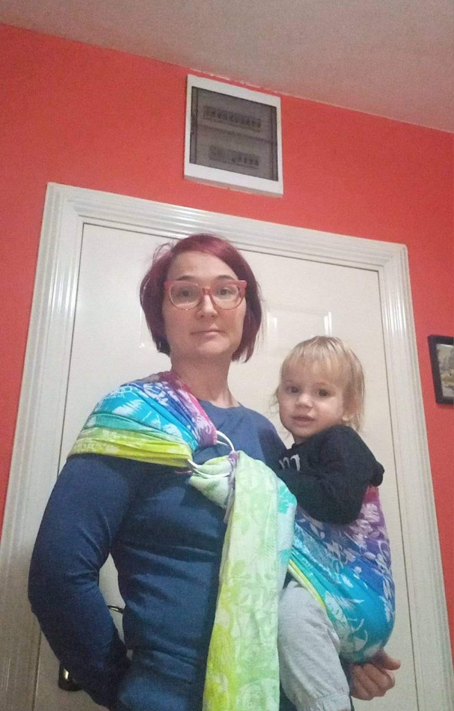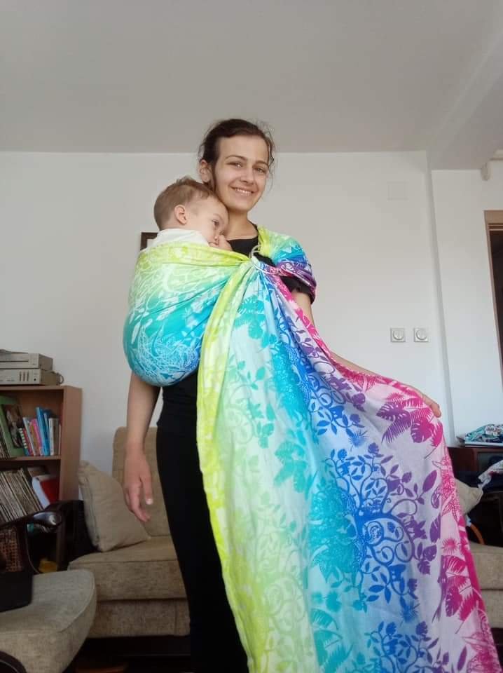 Thanks to Lenine putujuce nosiljke (Lena’s traveling carriers) and Luluna this is another Luluna ring sling we tried.Luluna jungle rainbow glory size M. I especially like the beautiful pattern and colors, as well as the softness of the material. The length is not to my taste because my arm is too long and I don’t know what to do with it. Baby carrier 21 months old, 12 kg successfully carried, not on long distances or for a long time. Mom tried to carry a big boy, 6 years old, weighing 19 kg, and she succeeded, but only for a short time. I am satisfied and would recommend this ring sling to those who don’t mind the longer hanging arm.