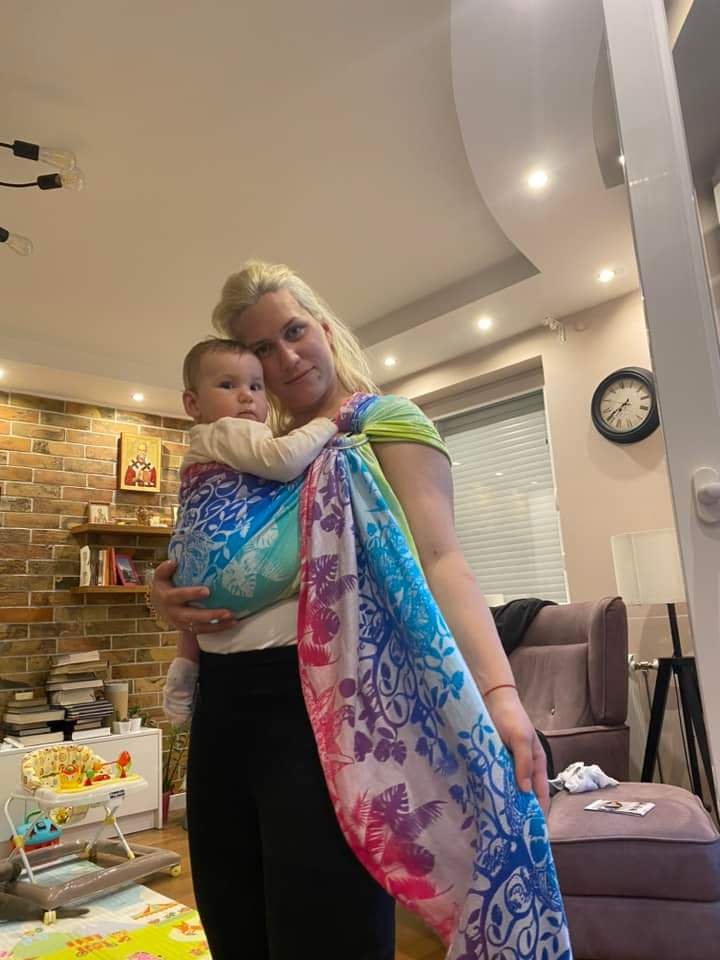 I wanna thank Lena’s traveling carriers and Luluna slings Balkan BST and chat for opportunity to test this ring sling. Baby is 10 months old and weights 13kg in the moment of testing. This is the first ring sling we tried. First of all i wanna say that print is very interesting and beautiful irl. Rs is little thicker but is generally easy to set up . We enjoyed in carrying for this short time RS was with us.