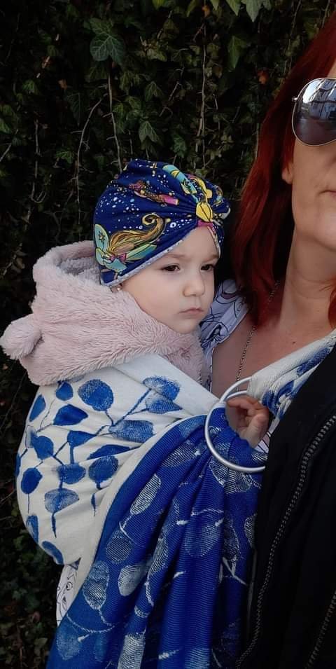 I’m not a fan of ring slings – that’s what I always say yet I keep exploring the world of ring slings. This one is so pretty, soft in hand and moldable that I couldn’t believe that material is all cotton. My child is 2yo and about 12kg and I didn’t feel his weight at all. Colours are beautiful as well as the pattern. I can easily imagine slinging a newborn in this one, as well as I carried my 2yo. Material is very soft and that left the biggest impression on me.