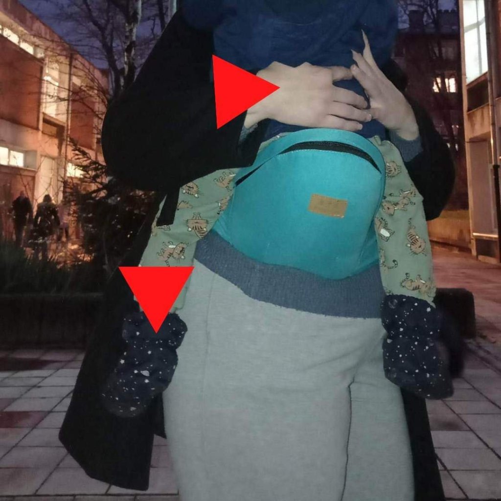 Položaj deteta nepravilan pri nošenju jer nogice vise, nije moguće postići položaj M