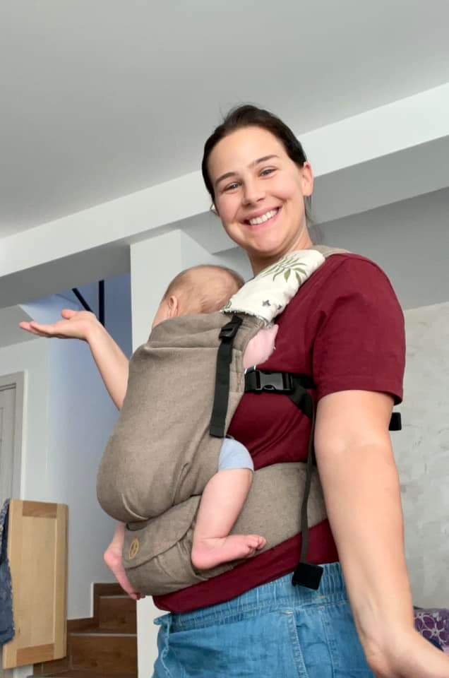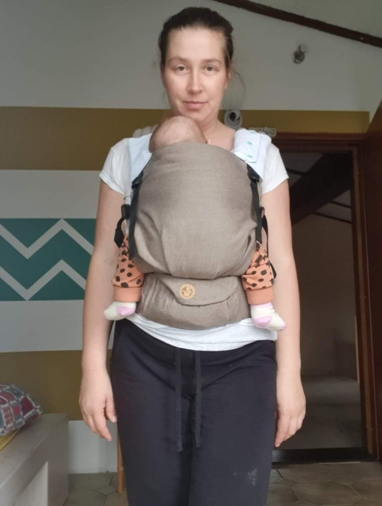 Thank you for the opportunity to try out this lightweight baby carrier; we are really satisfied, and the material is very pleasant. We tried using the X-strap configuration, and it’s even more comfortable for us. I think it would be great for summer, easy to adjust. The baby is two and a half months old and weighs 6kg.