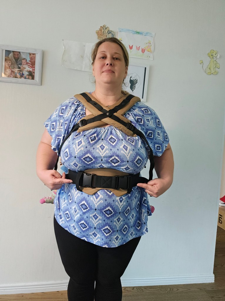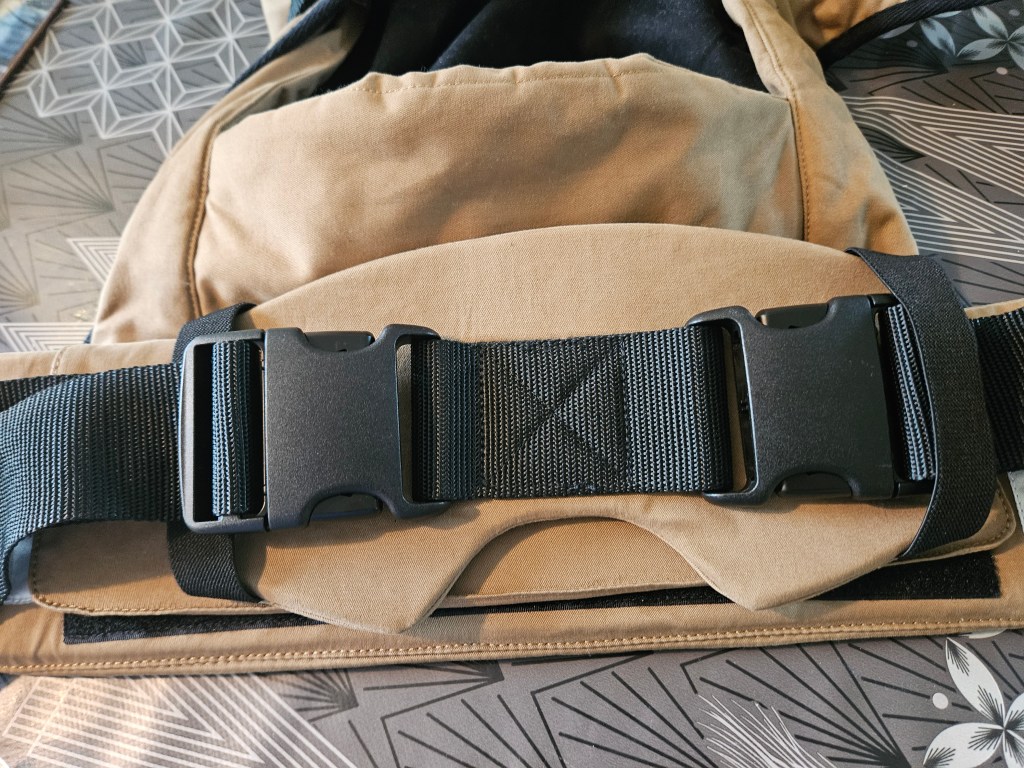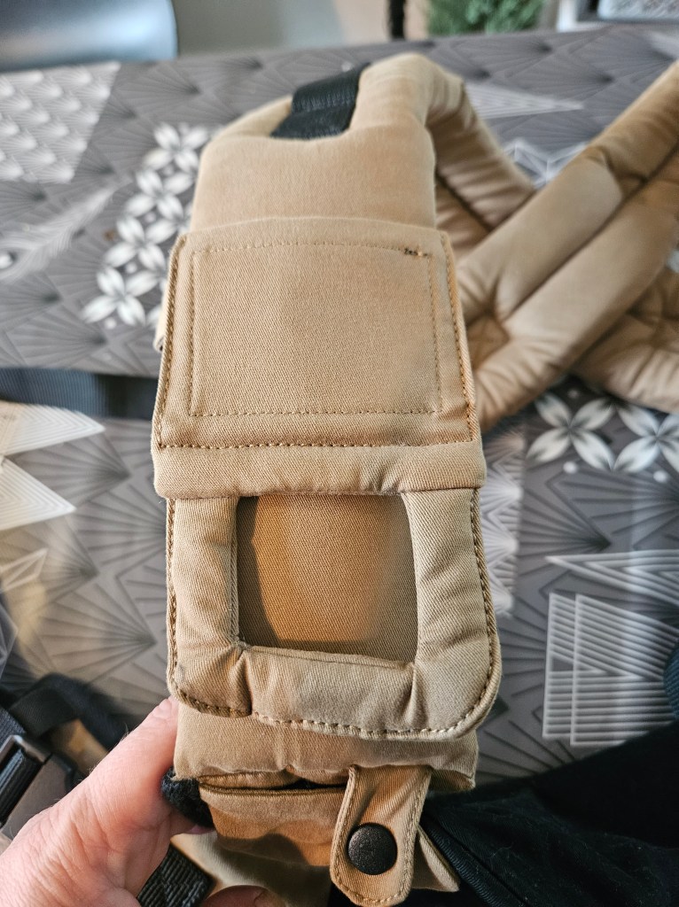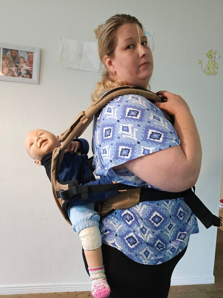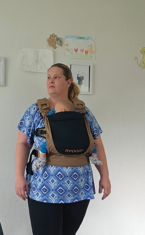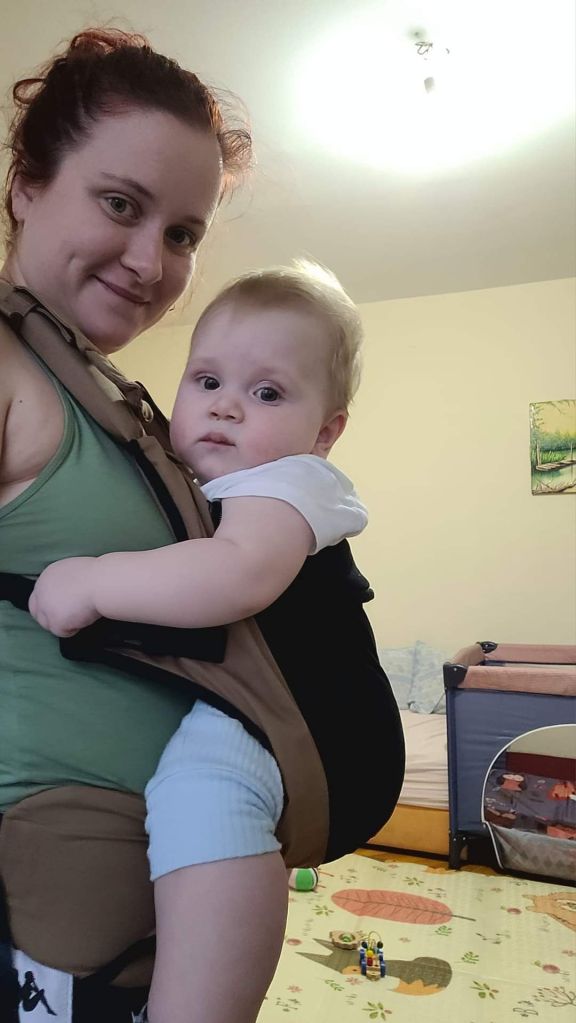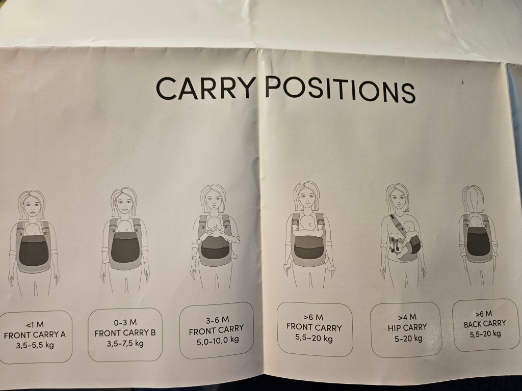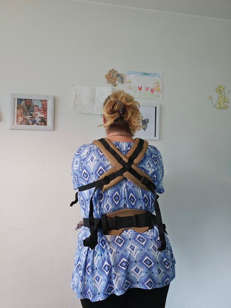 My 8 month old, weighting 10+ kg, outgrew the knee to knee support, but maintains the correct M shape. The carrier has x straps which are connected and you have to put them on over your and babys head. This was easy putting on, but combination of our big heads (he has a really big head) and my poor shoulder rotation made it hard to loose enough for easy dismount. Also front strap buckles made me realise how much weaker my left hand is. The straps are cushy and comfortable, and don’t move up your neck. I tried both apron and folded belt position, and found the folded one more comfortable. Unfortually my baby was uncooperative during our testing time, so we didn’t get a chance to try back or hip carrying. Thanks again Lena’s traveling carriers for this opportunity