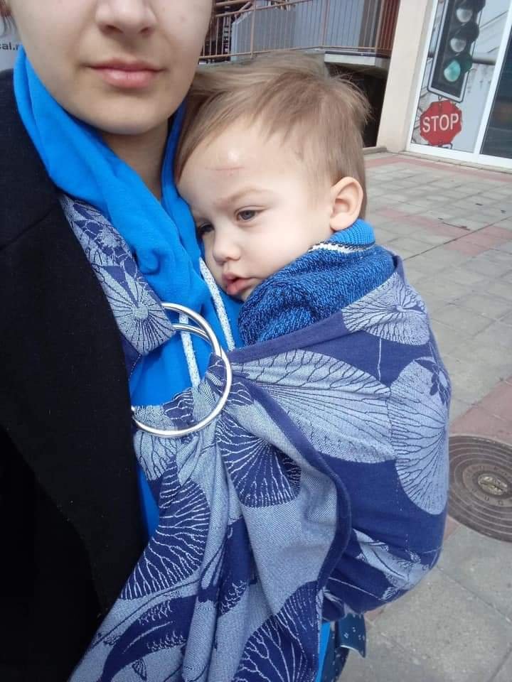I was so excited to try this ring sling because I’ve never tested pleated shoulder before. When I first thouched it, I thought it would be very uncomfortable, but I was wrong. The shoulder and material itself is very moldable. Material is a little thicker so I’d suggest it for spring and autumn and more experienced wrappers. It holds my two year old boy very well. He is 12kg and I was very surprised how it holds his weight. My father loves fishing, so that passion was passed on me, so I had to try this sling because of the pattern. Thanks, Lenine putujuce nosiljke (Lena’s traveling carriers) and Oscha Slings for this option.